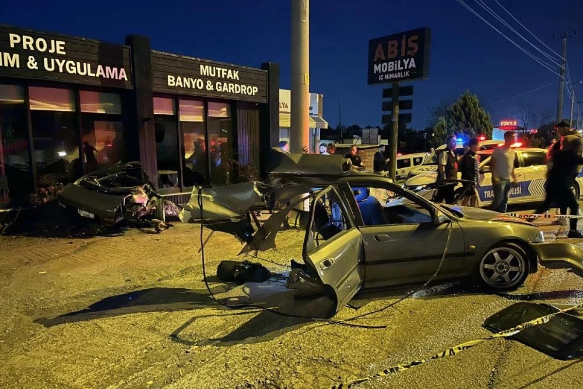 Direğe çarpmanın şiddetiyle otomobil ortadan ikiye bölündü. Otomobilin çarptığı yaya metrelerce savrulup yere çakılırken, otomobilin bölünen arka kısmı da yol kenarındaki iş yerine çarptı.