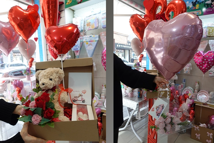 Mağazada Sevgililer Günü teması, ağırlıklı olarak kırmızı ve beyaz renkler ve kalp şeklindeki balon gibi ürünlerle kuruluyor.