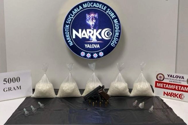 Yalova Emniyet Müdürlüğü tarafından yapılan çalışmalarda, yakın çevre illerden temin ettikleri uyuşturucu maddeleri kente naklederek sokak düzeyinde uyuşturucu madde ticareti yapacağı değerlendirilen 34 plakalı bir araç takibe alındı. Adli makamlardan alınan arama kararı doğrultusunda, araçta yapılan aramada 5 kilogram metamfetamin maddesi, 6 adet uyuşturucu madde içiminde kullanılan payp ve 1 adet tabanca ile 7 adet fişek ele geçirildi. Gözaltına alınan araç sürücüsü ve yanındaki şahıs, emniyetteki işlemlerinin ardından sevk edildikleri adliyede tutuklandı.Emniyet Müdürlüğünden yapılan açıklamada, “Yalova İl Emniyet Müdürlüğü koordinesinde toplum huzur ve güvenliğinin sağlanması, çocuk ve gençliğin sağlıklı geleceğine dair uyuşturucu madde suçlarının önlenmesine yönelik mücadelemiz kararlılıkla sürdürülecektir" denildi.