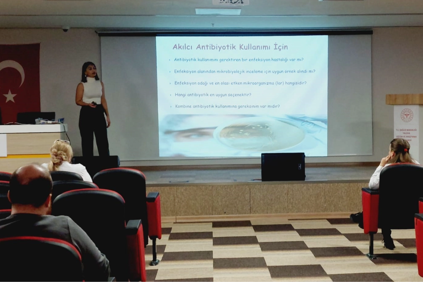 Enfeksiyon Hastalıkları ve Klinik Mikrobiyoloji Uzmanı Dr. Özenir Kocabıyık tarafından verilen, akılcı antibiyotik kullanımı eğitiminde aynı zamanda da profilaktik antibiyotik kullanımına değinildi. Antibiyotiklerin yanlış kullanımının uzun vadede etkilerinin ciddi olabileceği, bu yüzden doğru tedavi yöntemlerinin takip edilmesinin önemine dikkat çeken Kocabıyık, antibiyotik tedavisi öncesinde yapılması gerekenler üzerine; Antibiyotik kullanımını gerektiren bir enfeksiyon hastalığı var mı? Enfeksiyon alanından mikrobiyolojik inceleme için uygun örnek alındı mı? Enfeksiyon odağı ve en olası etken mikroorganizma hangisidir? Hangi antibiyotik en uygun seçenektir? Kombine antibiyotik kullanımına gerek var mı? Gibi konuları ele alarak, katılımcılarla birlikte interaktif bir bilgi paylaşımı gerçekleştirdi.