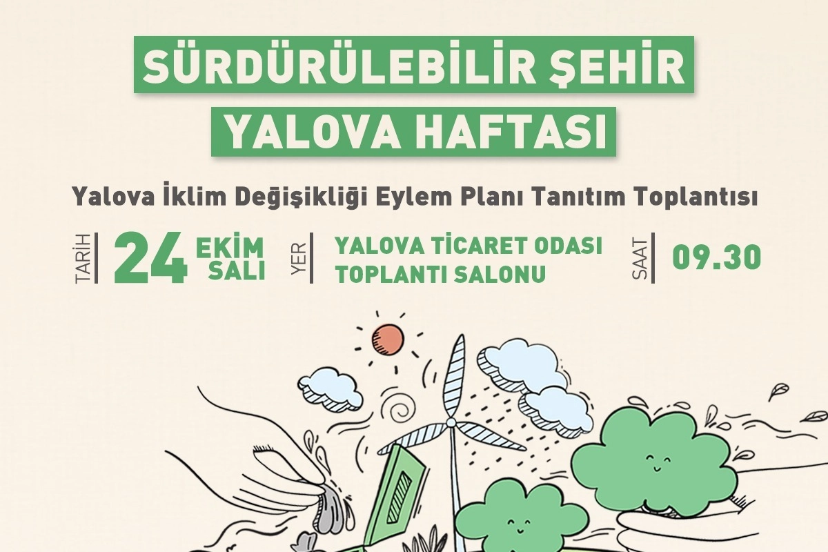 24 Ekim: Yalova İklim Değişikliği Eylem Planı Tanıtım ToplantısıYalova Belediyesi ev sahipliğinde, Çevre, Şehircilik ve İklim Değişikliği Bakanlığı ve TÜBİTAK MAM’ın katkılarıyla 24 Ekim Salı günü saat 09.30’da Yalova Ticaret Odası Toplantı Salonu’nda Yalova İklim Değişikliği Eylem Planı Tanıtımın Toplantısı gerçekleştirilecek. Yalova’nın enerji verimliliği, yeşil enerji kullanımı ve karbon ayak izi azaltma konularına yer verilecek.