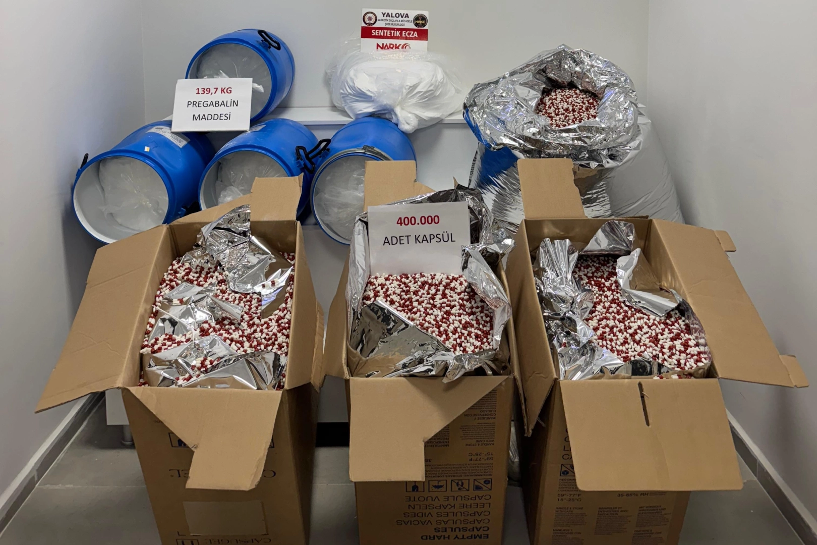 Operasyonlarda 5 parça halinde toplam 139 kilo 700 gram sentetik ecza yapımında kullanılan pregabalin maddesini ve 4 parça halinde dolum yapılmaya hazır 400 bin adet sentetik ecza kapsülü ele geçirildi. Alınan bilgiye göre, İl Emniyet Müdürlüğü Narkotik Suçlarla Mücadele Şubesi ekipleri, Yalova’ya seyir halinde olan 35 plakalı 2 araçta uyuşturucu madde olabileceğini değerlendirdi.