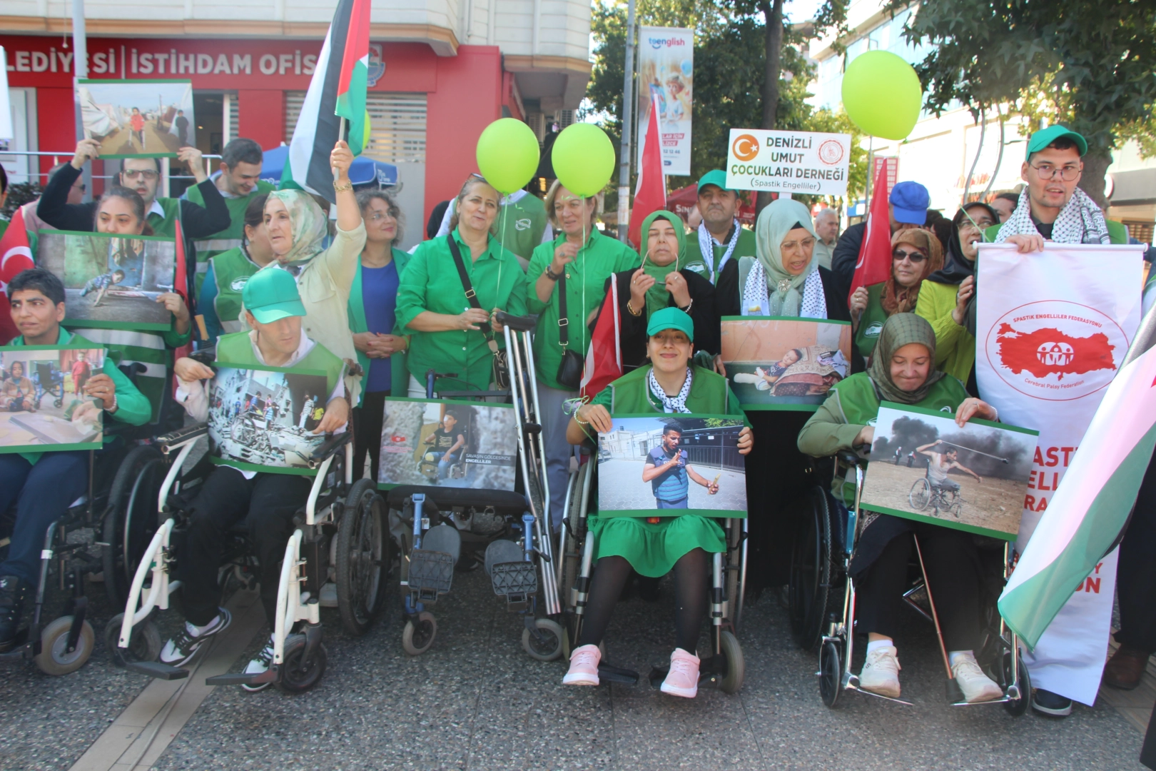“Katil İsrail Gazze’den defol” yazılı dövizler taşıyan engelli bireyler Gazze’de yaşanan soykırımı kınadı. Etkinlikte konuşma yapan Murat Arslanhan, Gazze'de 30 binden fazla kişinin katil İsrail yüzünden engelli hale geldiğini söyledi. Açıklamasına “Gazze'de dünyanın gözü önünde insanlığı sarsan, hukuku hiçe sayan, insan hakları ve barışa dair bütün kavramları hiçe sayan bir insanlık dramı yaşanmaktadır. Katil israilin aralıksız süren saldırıları sonucu yüzbinlerce sivil yaşamını yitirmiş, on binlerce kişi engelli kalmış ve tüm halk en temel yaşam haklarından mahrum bırakılmıştır” diye devam eden Murat Arslanhan, “Kriz ve savaş bölgelerinde çok sayıda engelli çocuk var. Engelliler çoğu zaman imkan ve destek bulamadıkları için hayatlarını zor şartlarda devam ettiriyorlar. Engelli bireyler, diğer sağlıklı bireylerle karşılaştırıldığında ölüme daha yakınlar ve tahliye için daha fazla zaman ihtiyacı duyuyorlar. Hatta önceden uyarı almış olsalar bile, zorlu ve saldırı tehdidi altındaki yolları kullanmak zorunda kalıyorlar ve engelli bireyler özel ihtiyaçlarını karşılayamıyorlar, örneğin tekerlekli sandalyelerini kaybediyorlar” ifadelerini kullandı.