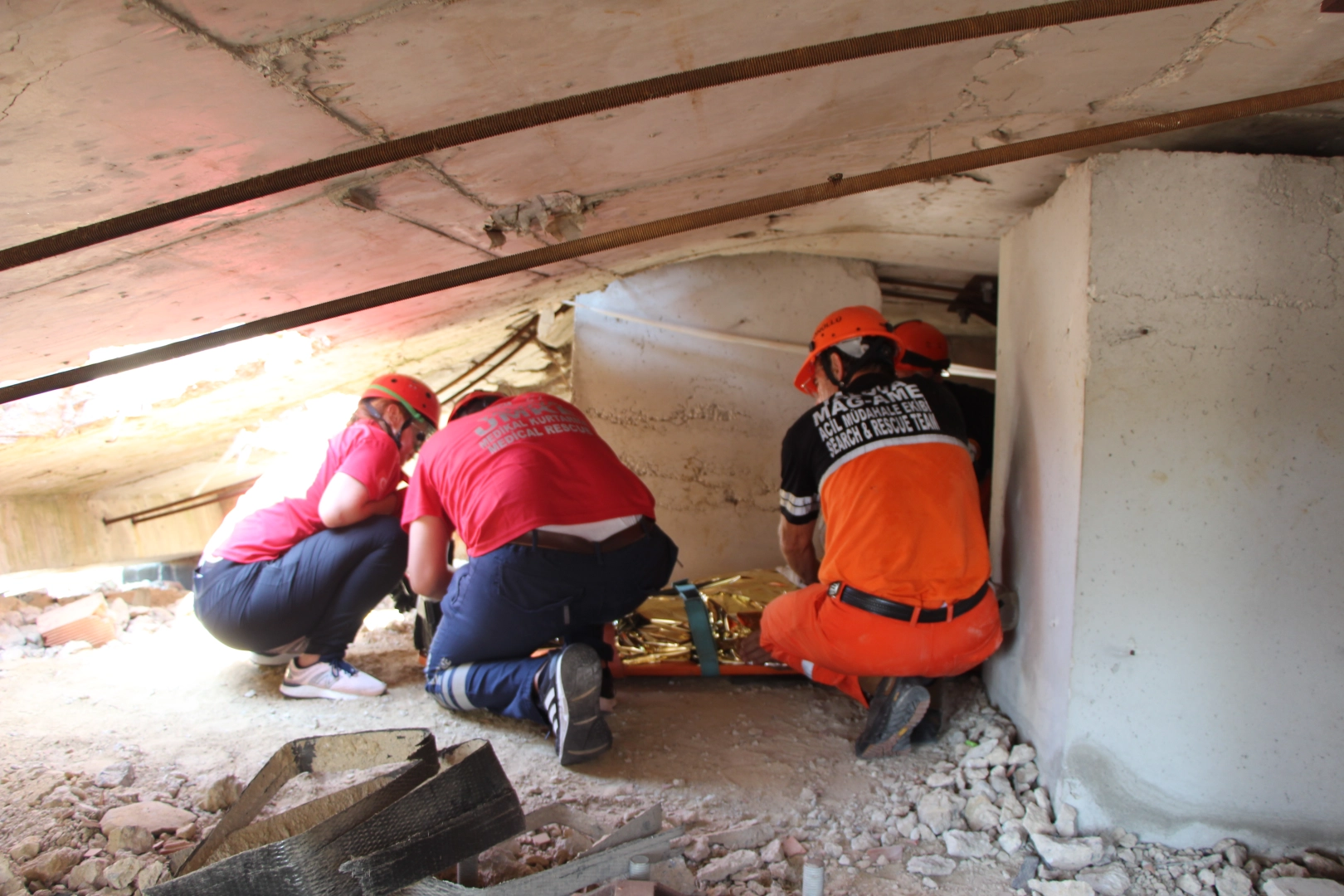 Enkazlara ulaşan ekipler çevre güvenliğini sağlayarak sesli ve kameralı arama çalışması gerçekleştirdi. Yapılan aramada enkaz altında olduğu belirlenen yaralılar sağlıkçılar tarafından kontrolden geçirildiler. Ardından sedyelere alınan yaralılar ekipler tarafından enkazlardan çıkarıldılar. Tatbikatta gerçeğini aratmayan görüntüler yaşandı.