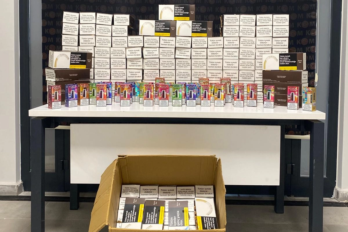 Sahte bandroller ve paketler kullanılarak, nargile tütünü üretimi yapıldığı tespit edilen depo içerisinde gerçekleştirilen aramalarda ise 60 bin adet içi kıyılmış tütünle doldurulmuş makaron, 77 bin 400 boş makaron, 175 kilo 500 gram nargile tütünü, 407 adet aroma verici, 20 bin adet sigara satışında kullanılan boş kutu, 2 bin 600 adet nargile boş plastik nargile kutusu, 350 kilo nargile tütünü ambalajında kullanılan poşet, 25 kilo açık tütün, 120 adet Jibiar ve Adelya markalarına ait nargile tütünü kutularına yapıştırmak üzere hazır kesilen sahte etiket, 1 adet rulo halinde üzerinde “tütün dumanı kansere yol açar” ibareli nargile tütün kutularına yapıştırılan sticker ele geçirildi.