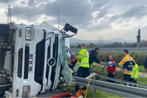 Yalova’dan otobana giren TIR, Orhangazi gişeleri yakınında henüz bilinmeyen bir nedenle kontrolden çıktı. Bariyerleri aşan TIR yan yatarak devrildi. Kazayı gören vatandaşlar, durumu sağlık, polis ve itfaiye ekiplerine bildirdi. Olay yerine gelen ekipler, devrilen TIR’ın kabininde sıkışan sürücüyü kurtarmak için çalışma başlattı. Uzun uğraşlar sonucu sürücü, bulunduğu yerden çıkarılarak ambulansla hastaneye kaldırıldı. Sürücünün sağlık durumunun iyi olduğu öğrenildi.
