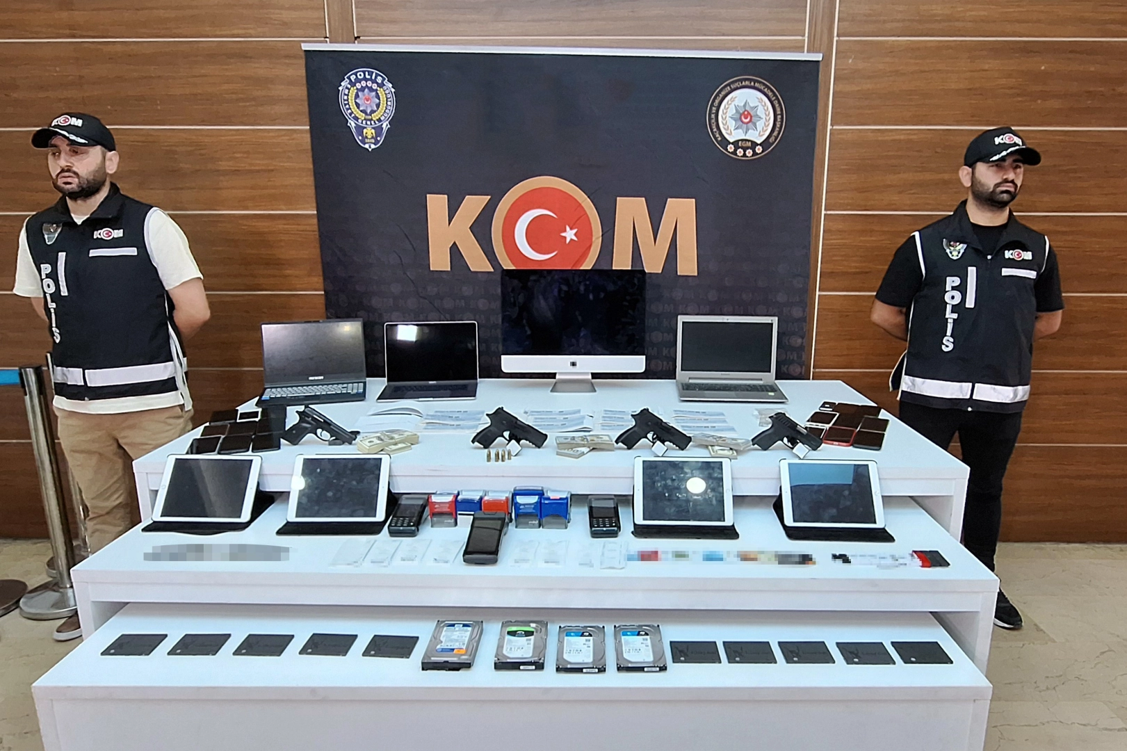 Şüphelilerin ev ve iş yerlerinde yapılan aramalarda ele geçirilen 4 adet ruhsatsız tabanca, 60 bin dolar, 3 adet pos cihazı, 18 adet banka ve kredi kartı, 85 adet slip, 5 gram uyuşturucu olduğu değerlendirilen madde, 10 adet farklı şirketleri ait kaşe, 12 adet farklı şirketlere ait imzalı çek karneleri, 12 adet e-imza USB bellek, 12 adet hard disk, 4 adet tablet, 1 adet bilgisayar kasası ve 20 adet cep telefonu İstanbul Emniyet Müdürlüğünde sergilendi.