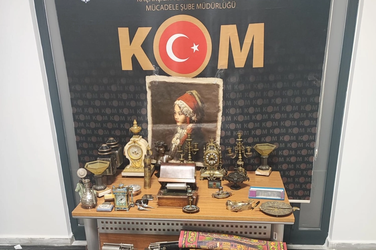 Yalova Kaçakçılık ve Organize Suçlarla Mücadele Şube Müdürlüğü ekipleri durdurdukları bir araçta arama yaptı. Aramada, Osmanlı dönemine ait olduğu değerlendirilen 1 adet mermer şömine saati, 1 adet bronz şömine saati, 4 adet bronz şamdan, 1 adet bronz kadın heykeli, 1 adet Çin mineli şömine saati, 3 parça pirinç ibrik, 2 adet fayton feneri, 1 adet bronz şekerlik, 1 adet gümüş gelin kemeri, 1 adet gümüş sigara tabakası, 4 parça mineli hokka takımı, 2 adet gümüş Kur'an-ı Kerim kabı, 1 adet kaplumbağa kabuğundan yapılmış sigara tabakası, 1 adet gümüş mineli sigara tabakası, 1 adet savat tabir edilen sigara tabakası, 1 adet kağıttan yapılmış papya maşa tabakası, 1 adet at figürlü yeşil renkli biblo, 5 parçadan oluşan pirinç tabak, kılıç, kalem, maşa, 2 adet tavus kuşu biblo, 1 adet gümüş renkli tas, 1 adet kadın figürlü yağlı boya kadın portresi, 1 adet el dokuma kilim, 3 adet gümüş taşlı yüzük, köpek figürlü obje, 5 adet taş plak, 2 adet demir okkalı terazi, 1 adet çan, 2 adet at üzengisi, 20 adet bakır tabak, 1 adet tas ve 1 adet tepsi ele geçirildi.