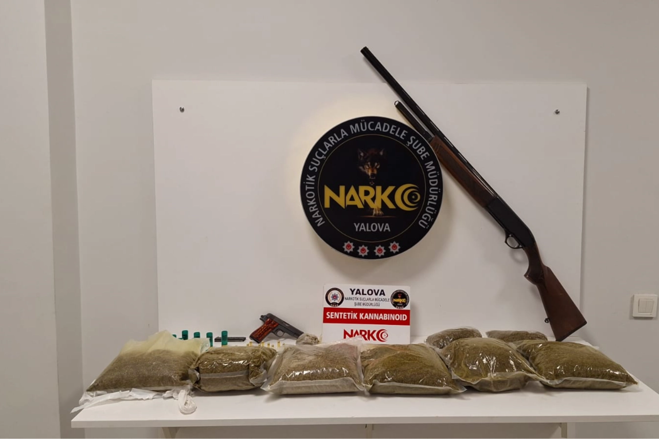 Adli makamlardan alınan arama kararı ile narkotik maddeler arama köpeği Zeytin eşliğinde gerçekleştirilen üst ve ikametgâh aramalarında ise 6 kilogram sentetik kannabinoid (bonzai) maddesi, 1 adet uzun namlulu tüfek, 10 adet av tüfeği fişeği, 1 adet tabanca, 17 adet tabanca fişeği ele geçirildi.