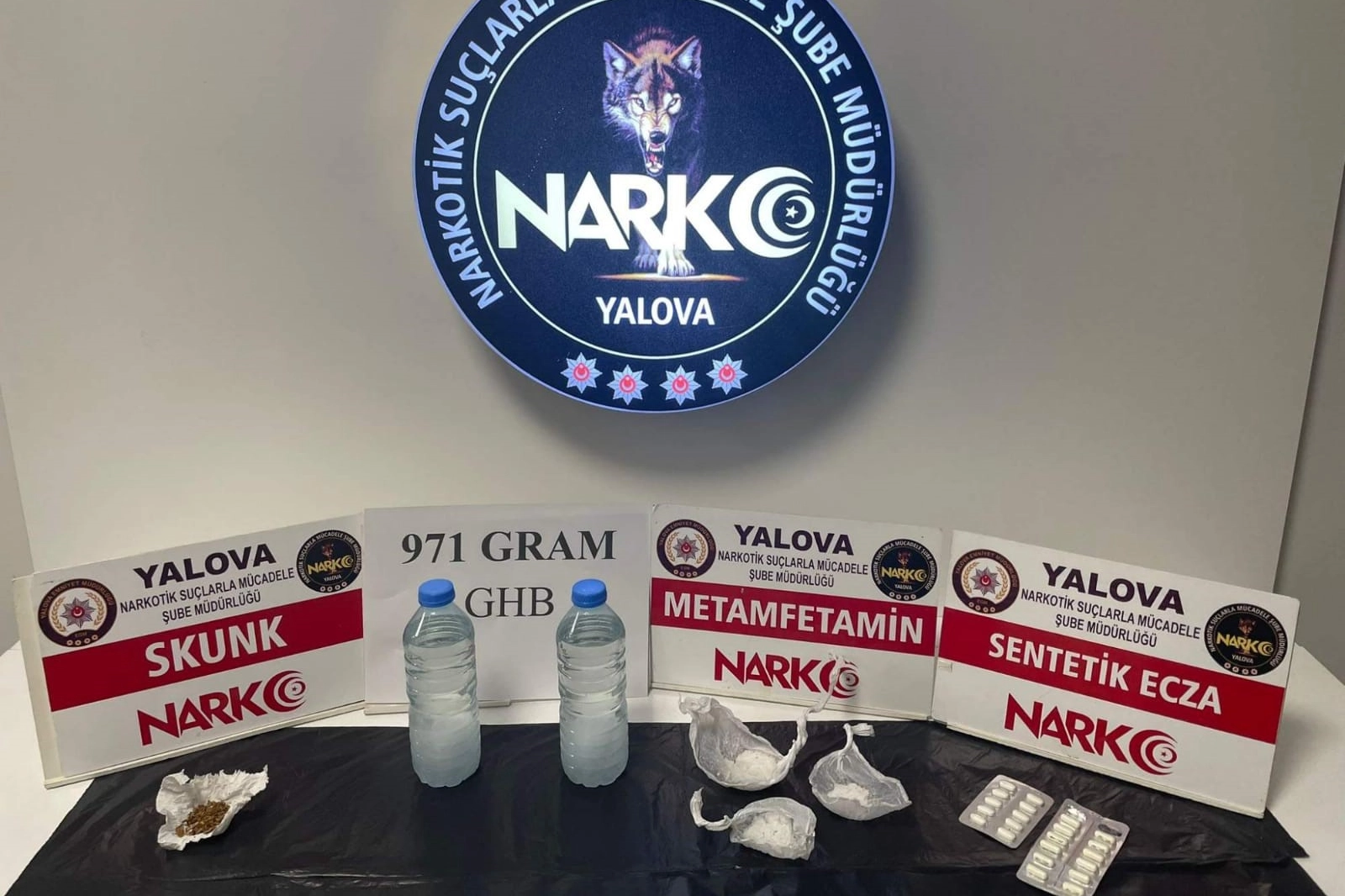 Yalova’ya uyuşturucu madde getirileceği istihbaratını alan Yalova polisi düğmeye bastı. İstihbari çalışmalar sonucunda, yakın çevre illerden temin edeceği uyuşturucu maddeler ile sokak düzeyinde uyuşturucu madde ticareti yapacağı ve yaptıracağı değerlendirilen A.P. isimli şüpheli, kendi sevk ve idaresindeki 34 plakalı araçla takibe alındı. Güzergahta ekipler tarafından trafik ve yol emniyeti sağlanması üzerine, seyir halindeki şüpheli araca dur ihtarı ile şok müdahalede bulunularak şüpheli A.P. yakalandı ve etkisiz hale getirildi. Yakalanan şüphelinin ilk etapta yapılan aramasında, uyuşturucu madde olabileceği değerlendirilen bir miktar şüpheli madde ele geçirildi. Adli makamlardan alınan arama kararı gereğince, narkotik maddeler arama köpeği Zeytin eşliğinde gerçekleştirilen araç ve ikametgah aramalarında ise 2 ayrı pet şişe içerisinde sıvı halde uyuşturucu veya uyarıcı maddelerden 971 miligram GHB maddesi (gama hidroksibütirat), 31 gram metamfetamin maddesi, 25 adet sentetik ecza hap, 1.35 gram skunk maddesi ele geçirildi.