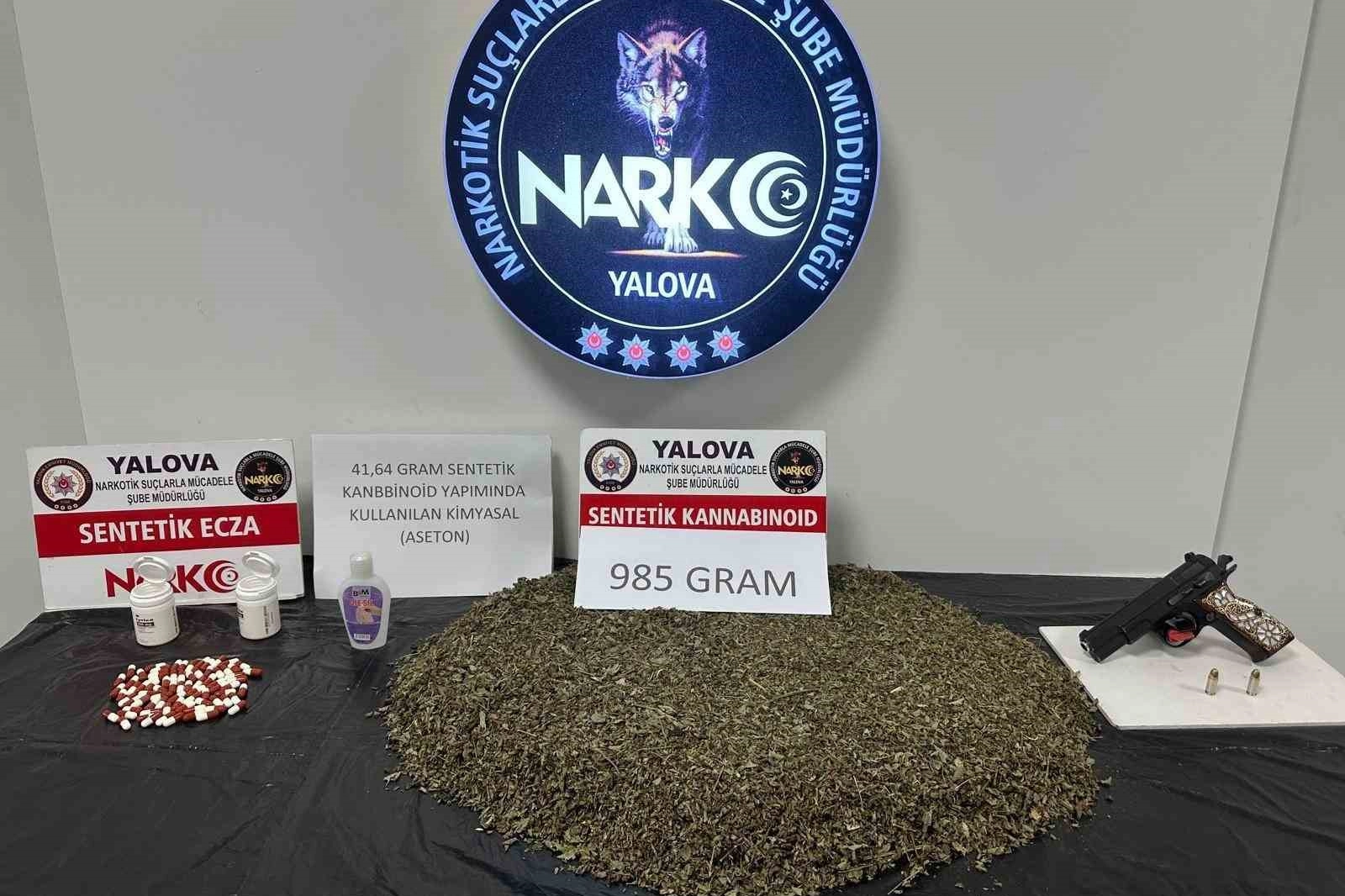 UYUŞTURUCU VE SİLAH YAKALANDIYapılan aramada 1 tabanca, 2 adet mermi, 78 adet sentetik ecza, 41,64 gram uyuşturucu madde yapımında kullanılan kimyasal madde, 2 parça halinde daralı ağırlığı 985 gram sentetik kannabinoid maddesi ele geçirildi. S.Ö ve T.Ö sevk edildikleri mahkemece tutuklanarak cezaevine gönderildi.