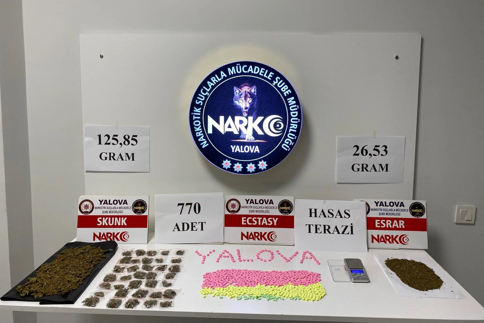 Yalova İl Emniyet Müdürlüğü Narkotik Suçlarla Mücadele Şube Müdürlüğü ekipleri, İstanbul’dan uyuşturucu madde getirdikleri belirlenen 3 şüpheliyi yakaladı. Şüphelilerin araç ve ikametlerinde yapılan aramalarda 770 adet ecstasy hap, 125,85 gram skunk maddesi, 26,53 gram esrar maddesi ve 1 adet hassas terazi ele geçirildi. Emniyetteki işlemlerinin ardından adliyeye sevk edilen şüphelilerden M.E. tutuklanırken, M.E.A. ve H.A. adli kontrol şartıyla serbest bırakıldı. Yalova İl Emniyet Müdürlüğü’nden yapılan açıklamada, halkın huzur ve güvenliğinin sağlanmasına yönelik başta uyuşturucu madde suçları olmak üzere suç ve suçlulara yönelik çalışmaların aralıksız ve kararlılıkla sürdürüleceği belirtildi.
