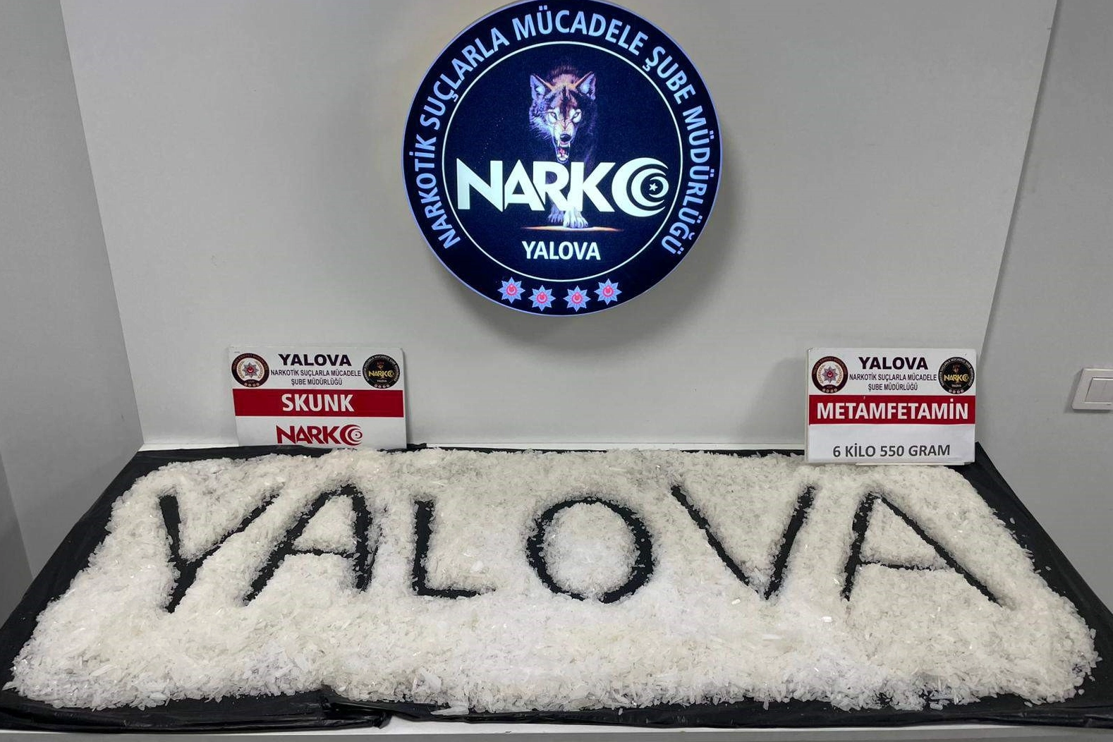 Edinilen bilgiye göre, Yalova İl Emniyeti Narkotik Suçlarla Mücadele Şube Müdürlüğü ekipleri, uyuşturucu madde sevkiyatı yapabilecekleri değerlendirilen 41 ve 34 plakalı araçları takibe aldı. Birbirleriyle koordineli şekilde hareket eden araçlar eş zamanlı olarak durduruldu. Narkotik maddeler arama köpeği "Zeytin" eşliğinde araçlarda yapılan çalışmada, 7 parça halinde paketlenmiş 6 kilo 550 gram metamfetamin ve 9.20 gram skunk ele geçirildi. Araçlarda bulunan M.S. F.S. ve Y.K. gözaltına alındı. Şüpheliler emniyetteki işlemlerinin ardından sevk edildikleri adli makamlarca tutuklandı.