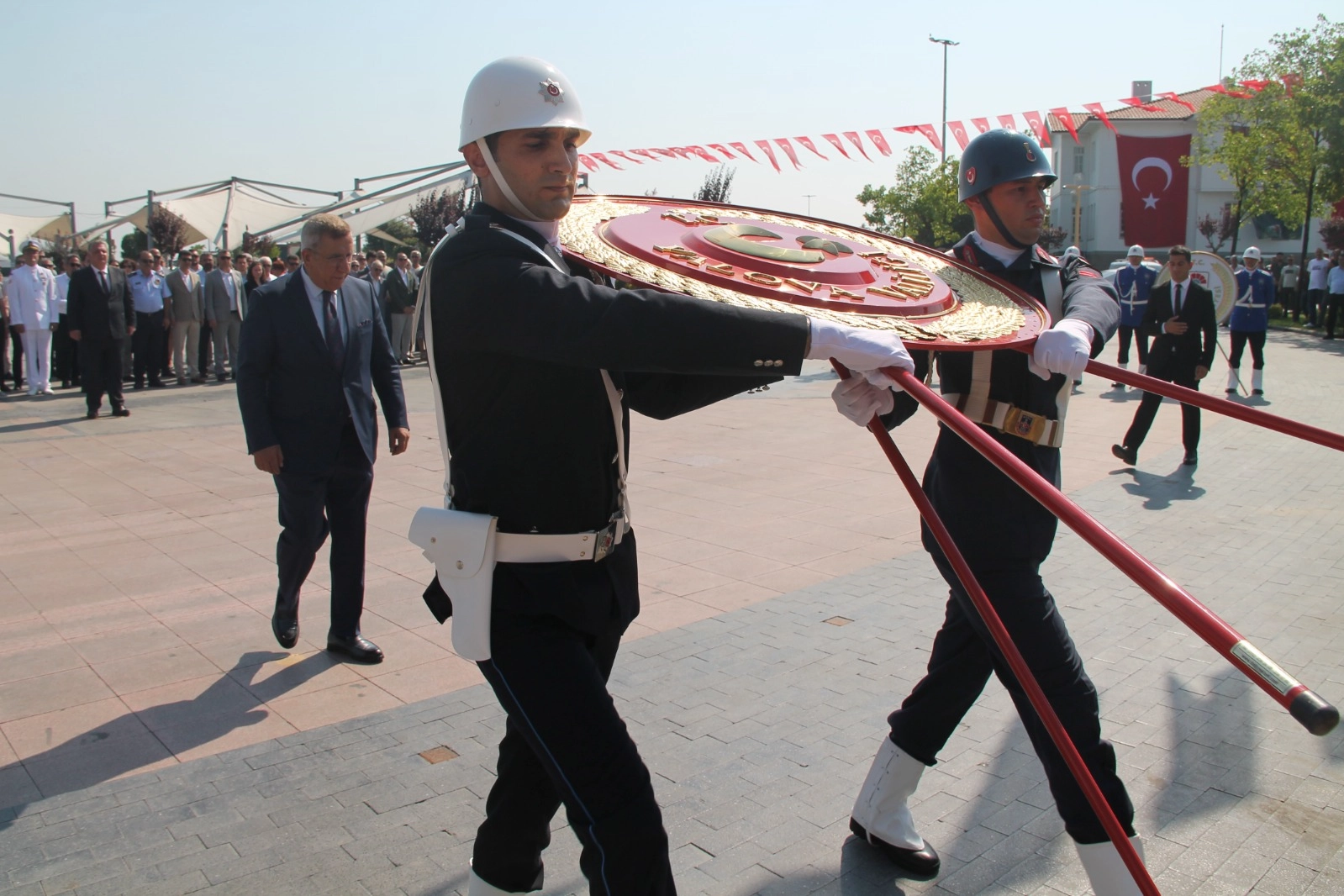 Yalova Vali Vekili Mehmet Bahattin Atçı, Yalova Belediye Başkanı Mehmet Gürel ve Karamürselbey Eğitim Merkezi ve Garnizon Komutanı Dz. Alb. Cenk Topuz tarafından Atatürk Anıtına çelenklerin sunulması sonrasında saygı duruşunda bulunularak İstiklal Marşı okundu.