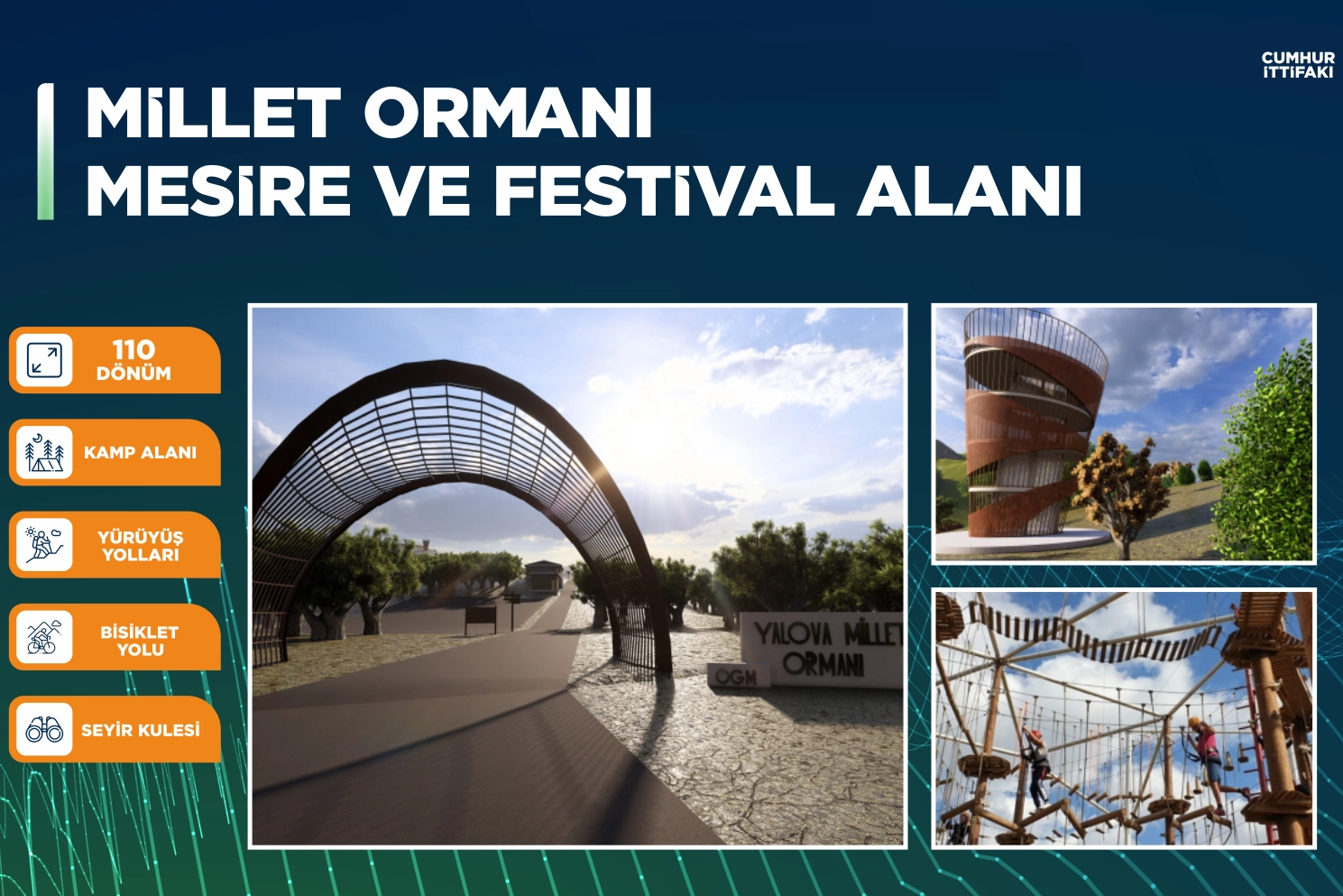 Yalova’da turizmin gelişimine de projeleri ile destek veren Yalova Belediye Başkanı Mustafa Tutuk bu çerçevede Millet Ormanı Mesire ve Festival Alanı oluşturacaklarını duyurdu. Bu proje çerçevesinde bir Karavan Parkı da Yalova’ya kazandırılmış olacak. Tutuk, projenin seçimden sonraki süreçte başlaması için ivedilikle çalışmanın startını vereceklerini ifade ederek, “Yeşili korumak adına attığımız adımlar bitmeyecek. Millet Ormanı Mesire ve Festival Alanı oluşturuyoruz. Burasını Orman Bakanlığımızdan tahsis alıyoruz. Kamp alanlarını yürüyüş yollarını biz yapıyoruz. Burada bisiklet ve yürüyüş yollarının yanı sıra bir seyir kulesi de yer alacak. 110 dönüm alanda inşa ediyoruz. İçinde seyir terası, mesire alanı, mini futbol-basketbol sahaları, çocuk parkları, bisiklet ve yürüyüş yolları yer alacak. Yalova’da bir ilke de ev sahipliği yapacak bu tesis. Burada karavan park ve kamp alanı da bulunacak. Karavan turizminin Yalova’ya gelmesi gerekiyor. İşte bu alan buna da imkan verecek. Şehrimizde düzenlenecek olan açıkhava festivallerine de bu alan ev sahipliği yapacak. Merkeze 8 kilometrelik bir mesafede, full deniz manzaralı olan 110 dönüm alanda oluşturulacak olan bu yer Yalova’mıza çok yakışacak” diye konuştu.