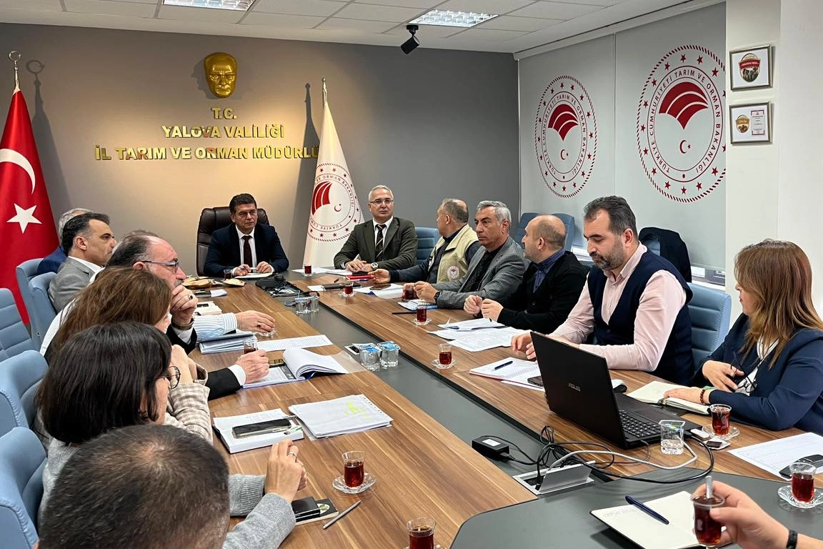 Yalova Tarım ve Orman İl Müdürü Selçuk Yaman başkanlığında düzenlenen toplantıda, 2024 yılı tarımsal üretim faaliyetleri ve projeleri değerlendirildi. Yalova Tarım ve Orman İl Müdürlüğü binasında gerçekleştirilen toplantıya ilçe ve şube müdürleri katıldı.Toplantıda, tarımsal ve hayvansal üretime yönelik yürütülen projeler, destekleme çalışmaları ve elde edilen sonuçlar detaylı bir şekilde ele alındı. Ayrıca, 2025 yılı projeleri ve hedefleri üzerine istişarelerde bulunuldu.