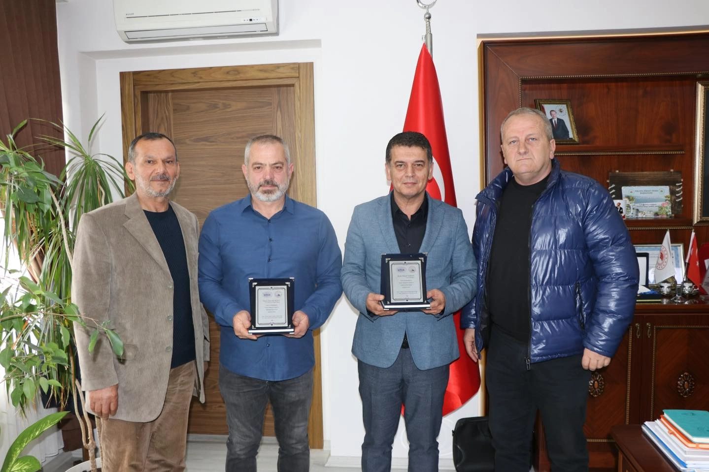 Yalova Deniz Ürünleri Avcıları Üreticileri Birliği (DEM-BİR) Başkanı Yusuf Baykan ve Yalova Merkez Su Ürünleri Kooperatifi Başkanı Hasan Karataş, Yalova balıkçılarına verilen desteklerden dolayı İl Tarım ve Orman Müdürü Selçuk Yaman ile Balıkçılık ve Su Ürünleri Şube Müdürü Hayrullah Kaya’ya plaket takdim etti.