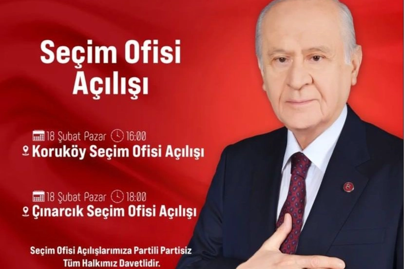 Milliyetçi Hareket Partisi Çınarcık İlçe Başkanlığı tarafından yapılan açıklamada, ‘’18 Şubat Pazar Günü ilk olarak saat 16.00’da Koruköy Seçim ofisimizi açıyoruz sonrasında ise saatler 18.00’ı gösterdiğinde Çınarcık Seçim Ofisimizi açacağız. Seçim Ofislerimizin açılışlarına partili, partisiz tüm halkımız davetlidir’’ ifadelerine yer verildi.