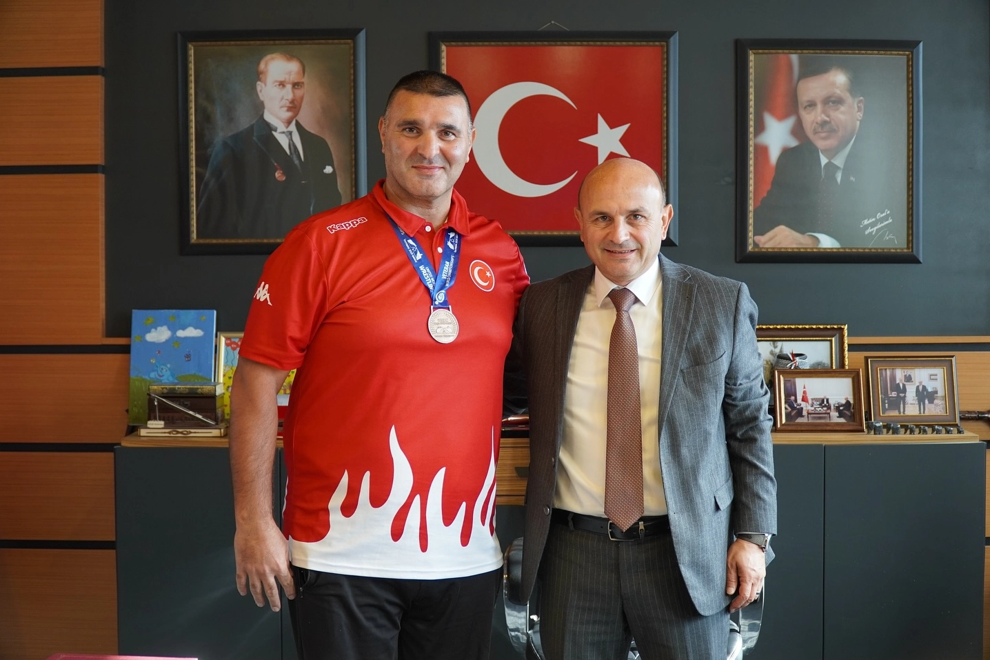 Altınova Belediyesi Güreş Takımı Koordinatörü Mustafa Bayram, Yunanistan'ın Loutraki Kentinde düzenlenen Veteranlar Dünya Şampiyonasında dünya üçüncüsü oldu. 2024 hedefi şampiyonluk Yunanistan’da dünya üçüncüsü olan Mustafa Bayram, Altınova Belediye Başkanı Dr. Metin Oral’ı makamında ziyaret eti. 50 kişilik Milli Takım kadrosunda birçok sporcunun kürsüye çıktığını dile getiren Mustafa Bayram, 2024 hedefinin dünya şampiyonluğu olduğunu söyledi. Sporda da Marka Kent Sporcusunu kutlayan ve ziyaretten duyduğu memnuniyeti dile getiren Altınova Belediye Başkanı Dr. Metin Oral, “Yunanistan’da düzenlenen Dünya Veteranlar Güreş Şampiyonası’nda 3. olan sporcumuz Mustafa Bayram’ı bizlere yaşattığı gurur için teşekkür ediyorum. Sporda Marka Kent Altınova ismini tüm platformlarda başarıyla duyurmaya, bayrağımızı dalgalandırmaya devam edeceğiz” ifadelerini kullandı.
