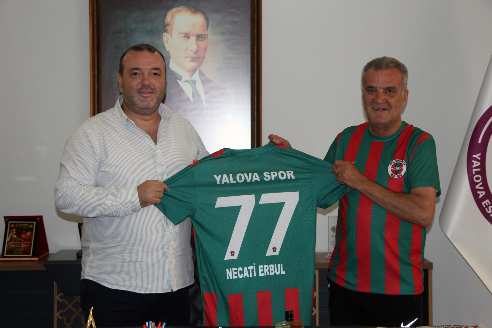Bölgesel Amatör Lig (BAL) hazırlıklarını hızla sürdüren Yalovaspor bir yandan da takıma destek veren isimleri ziyaret ederek, forma hediye etmeyi sürdürüyor. Bu çerçevede Yalovaspor Başkan Yardımcısı Ruhi Kaya, YESO Başkanı Necati Erbul’u odada ziyaret etti. Konuklarını makamında ağırlayan Erbul, Yalovaspor’a BAL’da başarı dileklerinde bulundu. Yalovaspor’un eski günlerine geri dönmesi ve yeniden profesyonel liglere tırmanmasını istediklerini dile getiren Erbul, “Yalovaspor bu ilin markası, bu ilin milli takımıdır. Yalova tarihinde Yalovaspor’un derin izleri vardır. Bu takım ilimize büyük başarılar ve mutluluklar yaşatmış tarihi, geleneği kökleri olan bir spor kulübüdür. O nedenle hepimizin Yalovaspor’u desteklemek gibi bir misyonu olmalıdır diye düşünüyorum. Yalovaspor mutlaka eski şanlı günlerine ve hak ettiği profesyonel liglere geri dönmelidir” dedi. Yalovaspor Başkan Yardımcısı Ruhi Kaya ise bu yıl iyi bir kadro kurduklarını ifade ederek, “Güçlü bir kadro ile BAL’a hazırlıklarımızı sürdürüyoruz. Grubumuz da belli oldu. Bu yıl grupta İstanbul ve Bursa takımlarının bulunmaması bizim açımızdan bir avantaj. İlk hedefimiz BAL’da bu yıl kalıcı olmak, ardından da profesyonel lige yükselmek. Tüm planlarımızı ve hazırlıklarımızı bu yönde sürdürüyoruz” diye konuştu. Ardından YESO Başkanı Necati Erbul, Yalovaspor Başkan Yardımcısı Ruhi Kaya ve beraberindekiler bir süre daha istişarelerde bulundular.