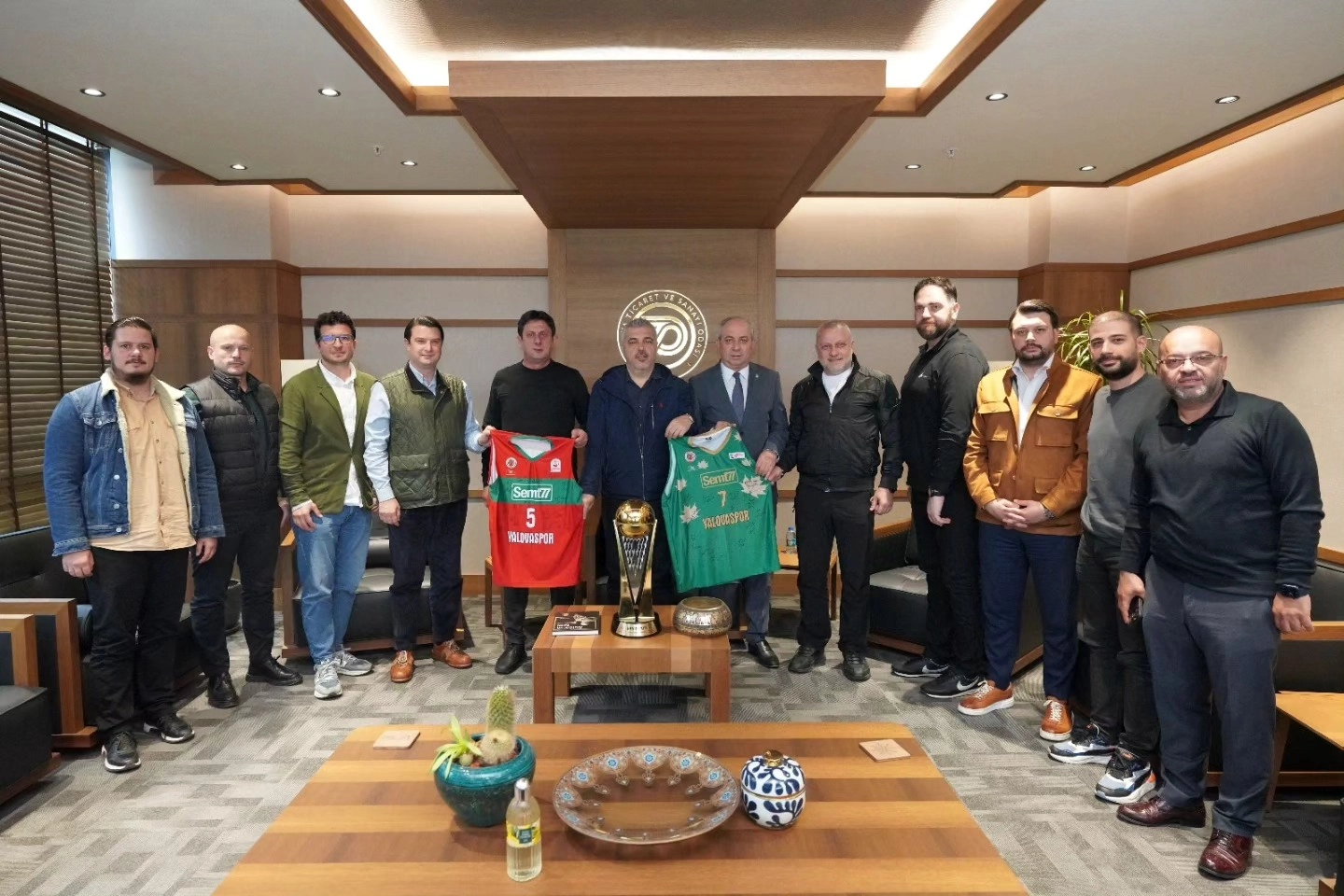 Türkiye Sigorta Basketbol Ligi’ni şampiyon olarak tamamlayan ve Süper Lig’de Yalova’yı temsil etmeye hak kazanan Semt 77 Yalovaspor Basketbol Takımı, şampiyonluk kupası ile beraber gerçekleştirdiği ziyaretlerine hız kesmeden devam ediyor. Bu kapsamda Şampiyon takımımızın sıradaki durağı Yalova Ticaret ve Sanayi Odası oldu. Ziyaret; Semt 77 Yalovaspor Kulüp Başkanı Orbay Tuna, Başkan Yardımcısı İlker Karbuz, Genel Menajer Murat Dönmez ve yöneticilerin katılımları ile gerçekleşti. Burada YTSO Yönetim Kurulu Başkanı Cemil Demiryürek ve YTSO Meclis Başkanı Muhammet Sarıoğlu ile bir araya gelen Semt 77 Yalovaspor yetkilileri, şampiyon takımın, şampiyon oyuncuları tarafından imzalanan formaları hediye olarak Demiryürek ve Sarıoğlu’na takdim etti.