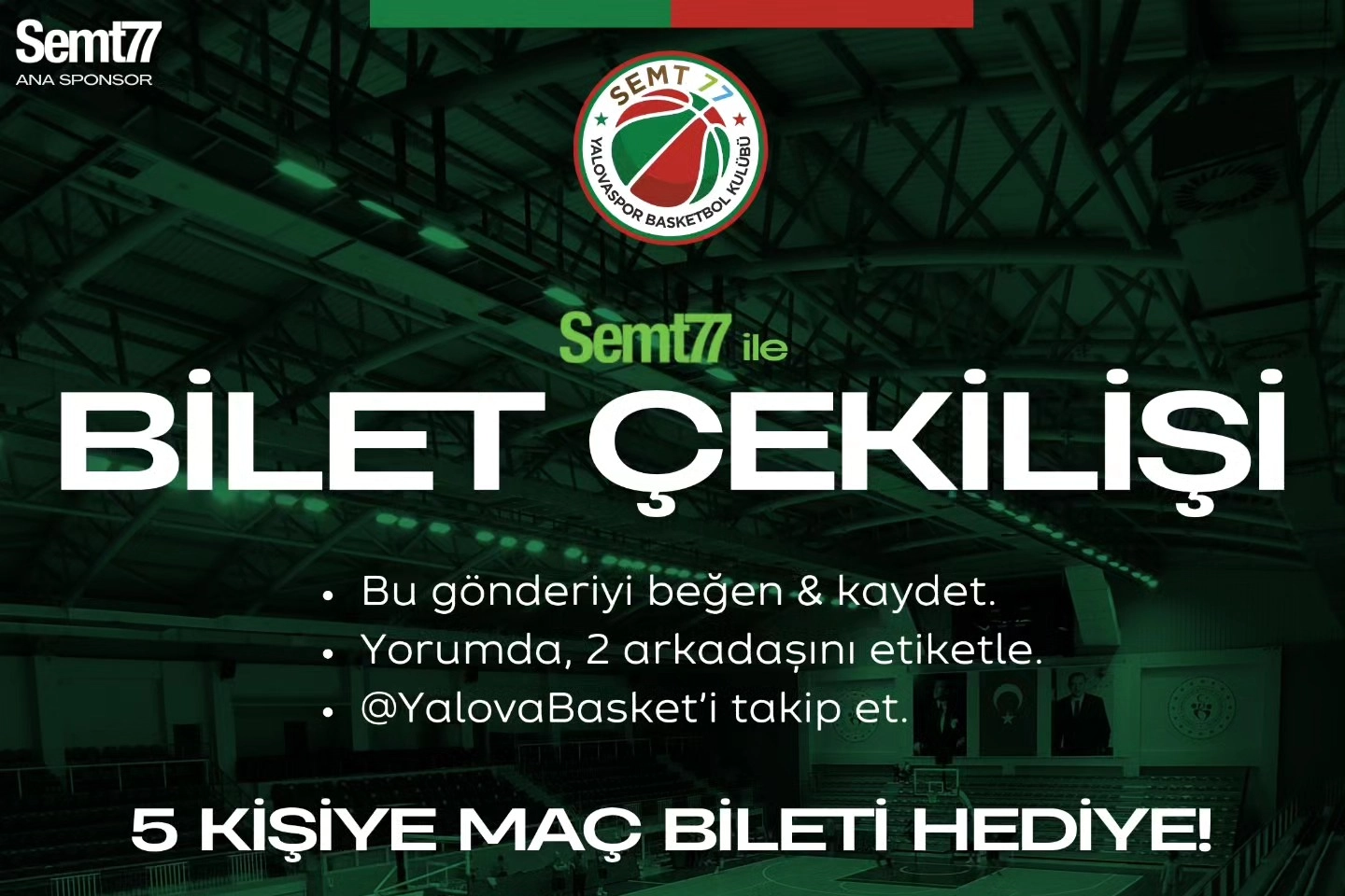 SEMT77 YALOVASPOR’DAN ÇEKİLİŞ HAKKINDASemt77 Yalovaspor Basketbol Kulübü sosyal medya hesapları üzerinden çekilişe dair yapmış olduğu açıklamada şöyle belirtti, ‘’Çekilişle 5 kişiye, 23 Mart Pazar günü saat 15.30'da evimizde oynayacağımız Karşıyaka maçında geçerli olacak "Numarasız Tribün" maç bileti HEDİYE!’’