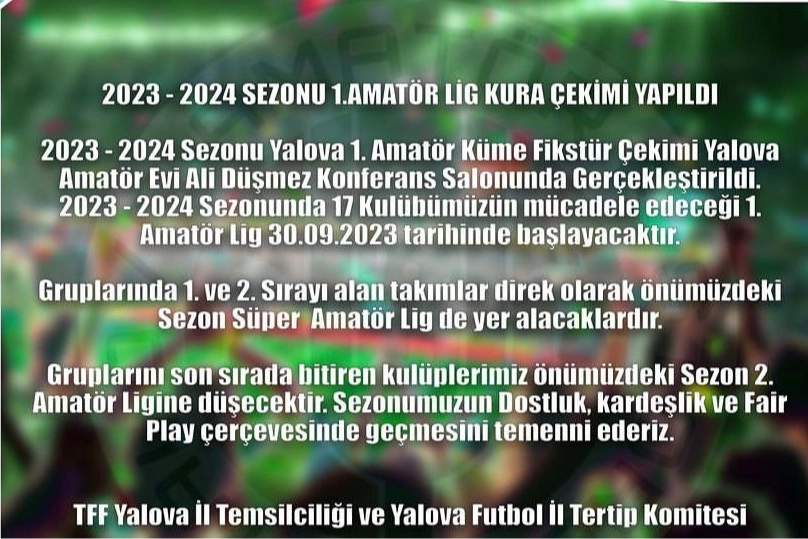Geçtiğimiz günlerde Yalova Amatör Evi Ali Düşmez Konferans Salonu’nda yapılan kura çekimleri sonucu Yalova 1.Amatör Lig A Grubu ve B Grubu olarak açıklandı. Ligi her iki grupta da ilk 2 sırada bitiren toplamda 4 takım gelecek sezonda direkt olarak Süper Amatör Lig’de yer alacak, bu sezon ligi son sırada bitiren kulüpler ise gelecek sezonda 2.Amatör Lig’e düşecek.