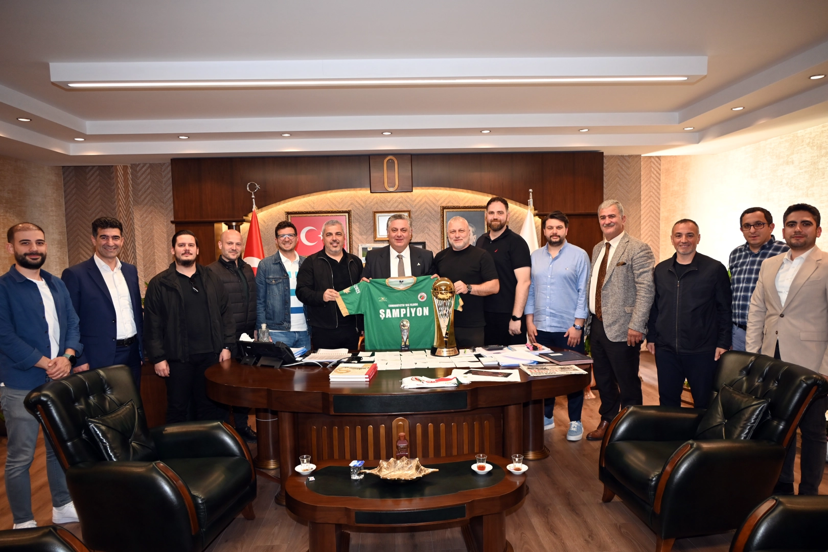 Mücadele verdiği Türkiye Sigorta Türkiye Basketbol Ligi’nin şampiyonu olan Semt77 Yalovaspor Basketbol Takımı’nın yöneticileri Yalova Belediye Başkanı Mehmet Gürel’i makamında ziyaret etti. Elde edilen kupa ile makama gelen yöneticiler, Başkan Gürel’e forma hediye etti.