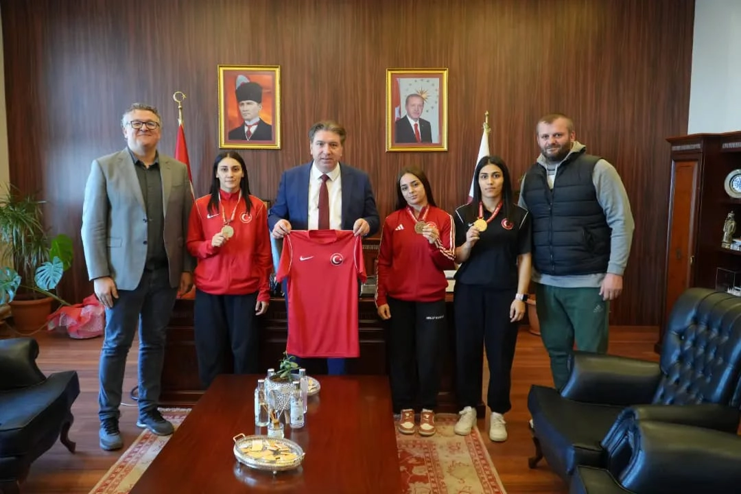 4 altın ve bir bronz madalya ile Yalova’nın spordaki başarısına bir yenisini daha ekleyen Termal Belediyespor Güreşçileri: Şevval Çayır, Tuba Demir, Sevim Akbaş, Dilan Tan ve Edanur Kanca, Yalova Üniversitesi Rektörü Prof. Dr. Mehmet Bahçekapılı’yı ziyaret etti.