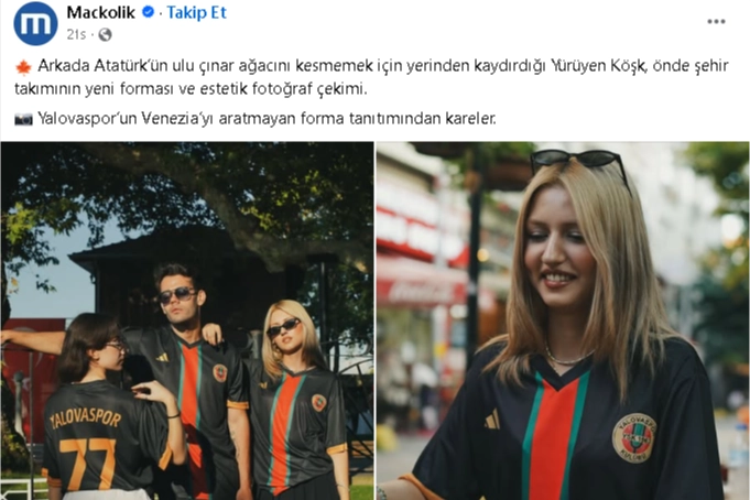 Maçkolik tarafından yapılan paylaşımda şu ifadelere yer verildi, ‘’Arkada Atatürk’ün ulu çınar ağacını kesmemek için yerinden kaydırdığı Yürüyen Köşk, önde şehir takımının yeni forması ve estetik fotoğraf çekimi. Yalovaspor’un Venezia’yı aratmayan forma tanıtımından kareler.’’