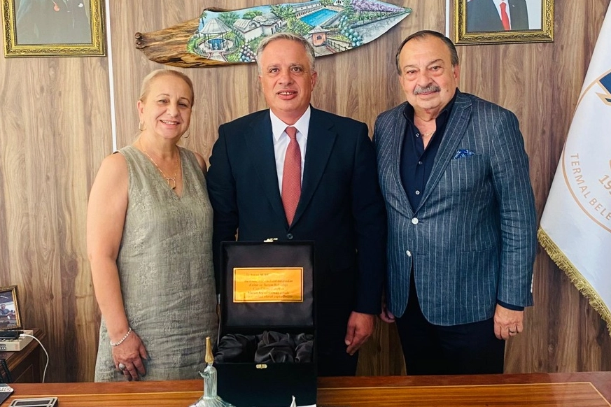 A Grup Yönetim Kurulu Başkanı Ali Ulvi Erim ve eşi Meliha Erim, Termal Belediye Başkanı H. Sinan Acar’ı makamında ziyaret etti. Ziyaretten duyduğu memnuniyeti ifade eden Başkan Acar, Erim’e Termal ilçesi, Termal Belediyesi ve belediye çalışmaları hakkında bilgi verdi. Ali Ulvi Erim, Termal ilçesinin sadece Marmara Bölgesi için değil, özellikle kaplıcaları bakımından Türkiye turizmi için de büyük bir önem taşıdığını belirtti. Erim, “Termal Belediyesi’nin gerçekleştirdiği faaliyetler, bölgeye ve ülke turizmine çok önemli faydalar sağlıyor. Bu sebeple, Termal Belediye Başkanı H. Sinan Acar’ı ve çalışma arkadaşlarını tebrik ediyorum” dedi. Başkan Acar ise, Erim’in ziyaretinin kendileri için büyük bir motivasyon kaynağı olduğunu ifade ederek, “Termal ilçemizde turizmi ayakta tutmak ve yerli-yabancı turistlere gereken en iyi hizmeti sunmak amacıyla birçok önemli çalışmayı hayata geçiriyoruz” dedi. Ziyaret esnasında, Ali Ulvi Erim ve H. Sinan Acar bir süre daha istişarede bulunarak görüş alışverişinde bulundular. Erim, ziyaretin anısına Başkan Acar’a bir hediye takdim etti. M. Tunç Tanrıverdi