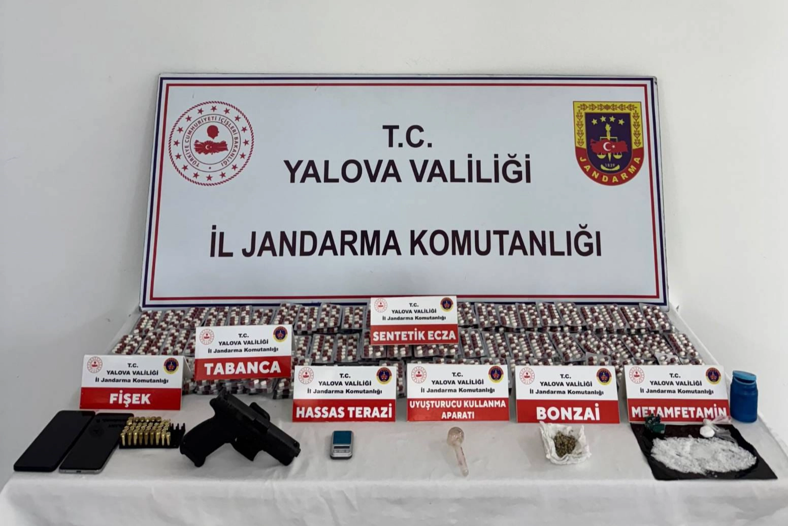 UYUŞTURUCU VE SİLAH YAKALANDIŞüphelilerin ikametlerinde yapılan aramada 2 bin 366 adet sentetik ecza hap, 23 gram metamfetamin, hassas terazi, uyuşturucu kullanma aparatı, tabanca, 41 tabanca fişeği, 2 cep telefonu ele geçirildi.