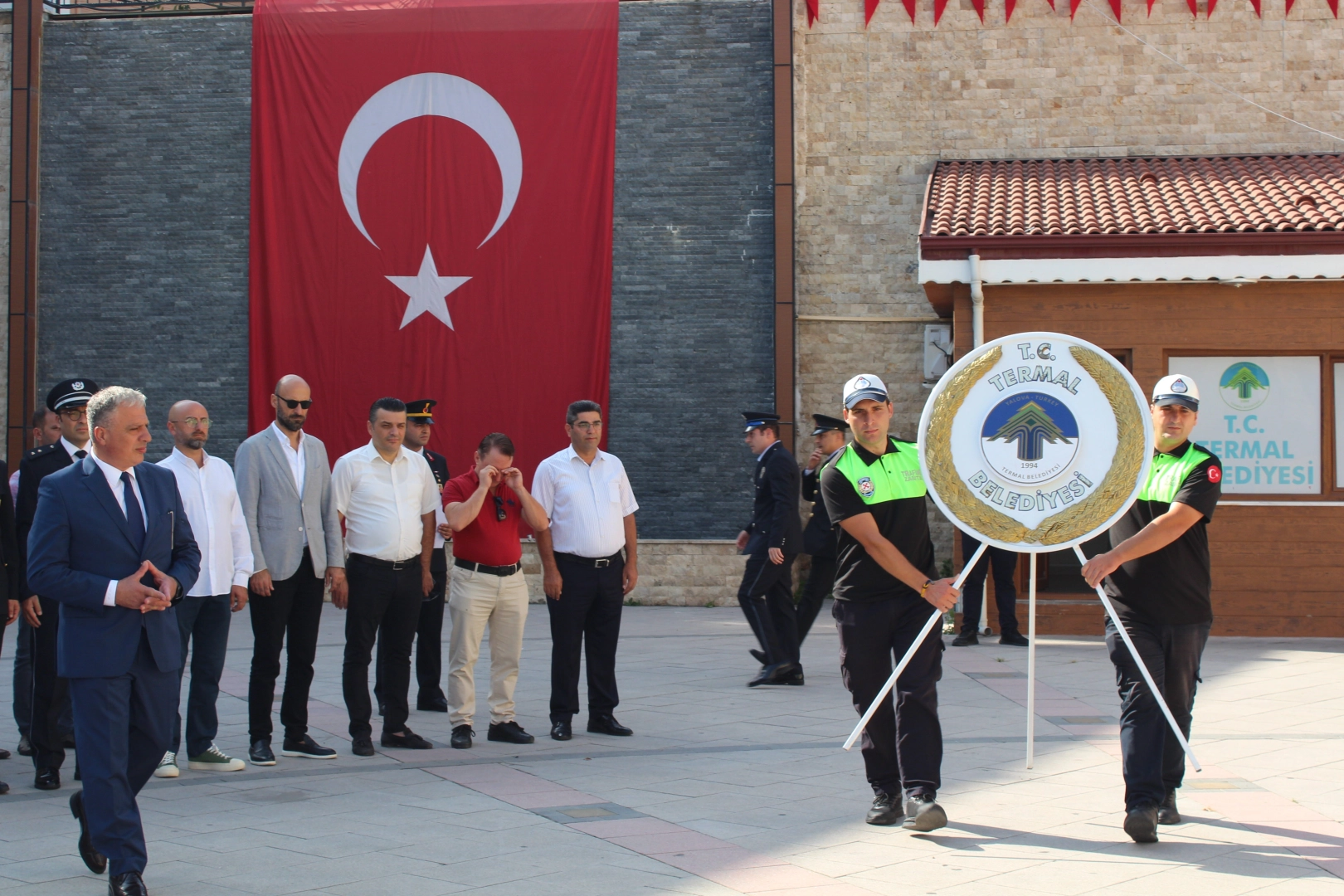Türk tarihindeki en önemli zaferlerden birisi olan Başkomutanlık Meydan Muharebesi’nin 101. yıl dönümü tüm yurtta olduğu gibi Termal ilçesinde de coşkuyla kutlandı. Bu çerçevede Termal Meydanı’nda gerçekleşen törene Termal Kaymakamı Faruk Doğru, Termal Belediye Başkanı H. Sinan Acar ve ilçe protokolü de katıldılar. Atatürk Anıtı’na çelenklerin sunulması sonrasında saygı duruşunda bulunularak İstiklal Marşı okundu. Tören coşkusu bir askerin günün anlam ve önemini belirten konuşması ve öğrencilerin okudukları şiirlerle doruğa çıktı. 30 Ağustos Zaferinin Türk tarihi açısından çok önemli bir dönüm noktası olduğunu ifade eden Termal Belediye Başkanı H. Sinan Acar ise, “Genciyle, yaşlısıyla, kadınıyla, erkeğiyle ülkemizin her köşesinden birlik beraberlik içerisinde milletimizin bağrından çıkan kahraman ordumuz, bu savaşta Türk milletinin gücünü ve cesaretini kanıtlamış, kazandığı bu büyük zaferi dünya tarihine altın harflerle yazdırmıştır. Böylesi şanlı bir ecdadın evlatları olarak bizlere düşen en önemli görev, geçmişimizden aldığımız güç ve cesaretle, bağımsızlık mücadelemizden asla ödün vermemek, geleceğimize azim ve kararlılıkla sahip çıkmaktır. Aziz milletimiz, 15 Temmuz’da olduğu gibi, canından aziz bildiği vatanı, bayrağı, ezanı uğruna ‘Ya İstiklal Ya Ölüm’ ruhuyla her türlü fedakarlık ve cesareti göstermeye hazırdır” dedi. Meydandaki törenin ardından Termal Kaymakamı Faruk Doğru, kaymakamlıktaki makamında tebrikleri kabul etti.