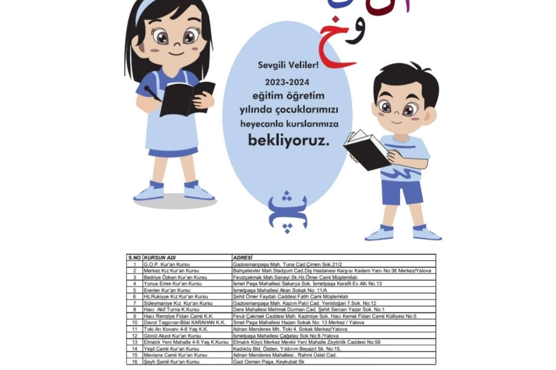 Yalova’nın çeşitli mahallelerinde gösterilecek olan kurslara müracaatlar başlatıldı. Kayıtlar 27 Temmuz 2023 tarihi itibarı ile hafta içi 09.00-13.00 saatleri arasında yapılmaya başlandı. Yalova Müftülüğü, tam gün ve yarım gün eğitimleri olan Kur’an Kurslarına 2023-2024 eğitim öğretim yılında çocukları heyecanla kurslara beklediklerini açıkladı. Kurslar hakkında bilgi almak için iletişim numarası 0226 814 50 43-Yalova İl Müftülüğü olarak belirlendi.