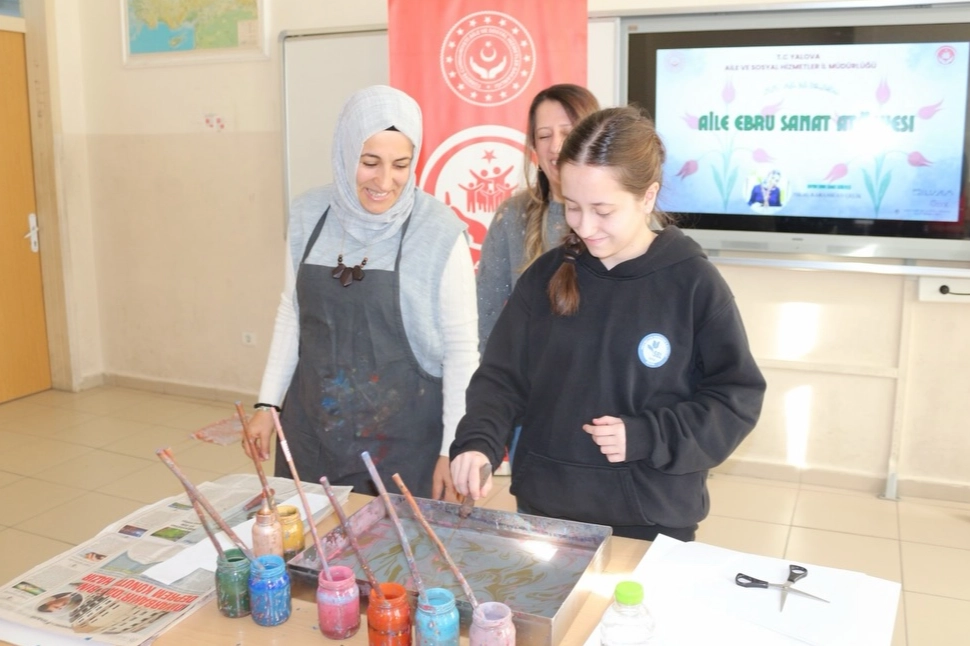 Düzenlenen "Aile Ebru Sanat Atölyesi", Ebru sanatçısı Hilal Karaaslan Çelik rehberliğinde hayata geçirildi.