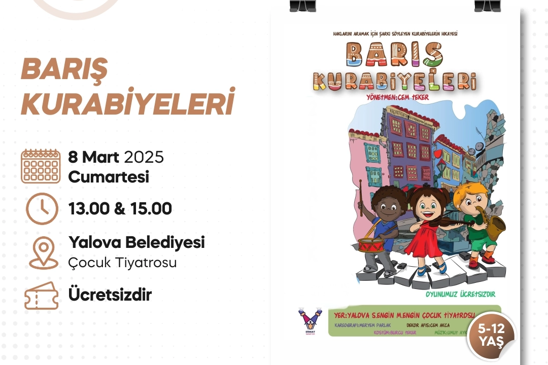 Saat 13.00 ve 15.00’te iki seans halinde gerçekleşecek olan oyun, 5-12 yaş aralığındaki çocuklar için sahnelenecek. Ücretsiz olarak sunulacak etkinlik, çocuklara barış ve dostluk değerlerini eğlenceli bir hikâye ile anlatıyor. Yönetmenliğini Cem Aker’in üstlendiği oyunda, farklı kültürlerden gelen çocukların birlikte yaşama ve dayanışma hikâyesi sahnelenecek. Eğitici içeriği ve renkli sahne performanslarıyla çocuklara keyifli anlar yaşatmayı hedefleyen Barış Kurabiyeleri, çocukları düşündürürken eğlendirecek. Çocuklarına özel bir tiyatro oyunu izletmek ve keyifli bir sanat deneyimi yaşatmak isteyene ailelerin rezervasyon işlemlerini etkinlik.yalova.bel.tr adresi üzerinden gerçekleştirebilecekleri belirtildi