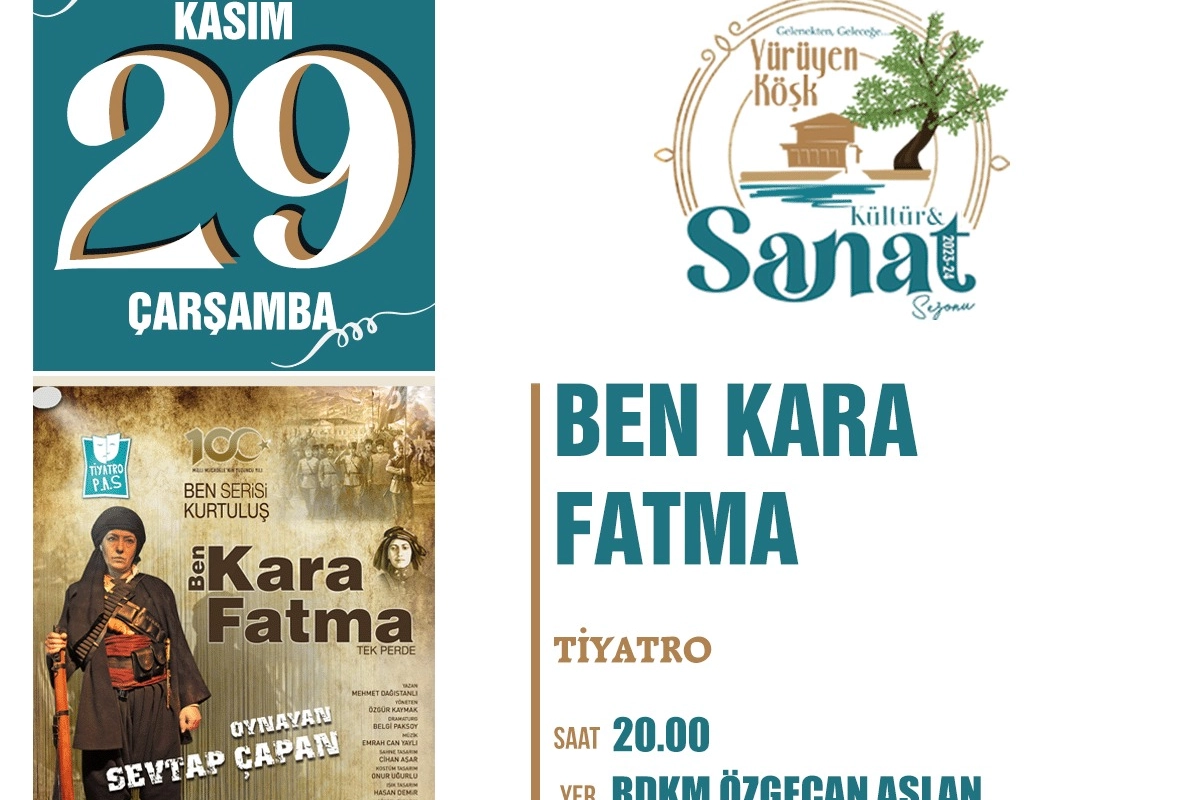 Kurtuluş Savaşı'nın kadın kahramanlarından olan Mustafa Kemal Atatürk’ün kendine verdiği takma ad ile anılan Kara Fatma’nın (Fatma Seher Erden) savaş yıllarında verdiği mücadeleyi anlatan ‘Ben Kara Fatma’ isimli tek perdelik tiyatro oyunu, Yalovalı izleyiciler için sahnelenecek. Raif Dinçkök Kültür Merkezi (RDKM) Özgecan Aslan Salonu’nda 29 Kasım Çarşamba günü saat 20:00’da ücretsiz olarak izlenebilecek. Kontenjanla sınırlı olan tiyatro oyununu izlemek isteyen izleyicilerin www.yalova.bel.tr adresinden kayıt yaptırabilecekleri bildirildi.