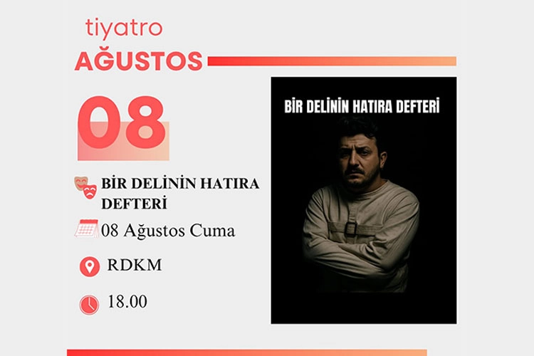 Etkinlik Detayları: Oyun: Bir Delinin Hatıra Defteri Tarih: 8 Ağustos Cuma Yer: RDKM (Raif Dinçkök Kültür Merkezi), Yalova Saat: 18.00 Etkinlik Ücreti: 300 TL