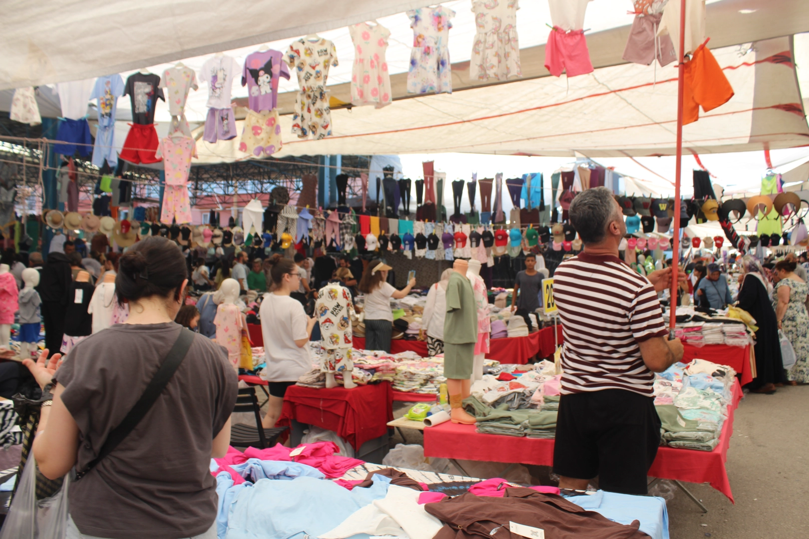 Fiyatı 250 ile 400 TL arasında değişen rengarenk muslin pantolonlar ve desenleriyle herkese hitap eden uzun elbiseler 500 TL’lik fiyatıyla kadın müşterilerden büyük ilgi gördü. 50 TL’den başlayıp 200 TL’ye kadar çıkan tişörtler ve taytlar da yine kadınların gözde ürünleri arasında yer aldı. 50 TL’ye satılan dantelli runnerlar çeyiz yapan kadın müşterilerin ilgi odağı olurken, el yapımı hasır mutfak gereçleri de çeyiz sandıklarında yerini aldı.