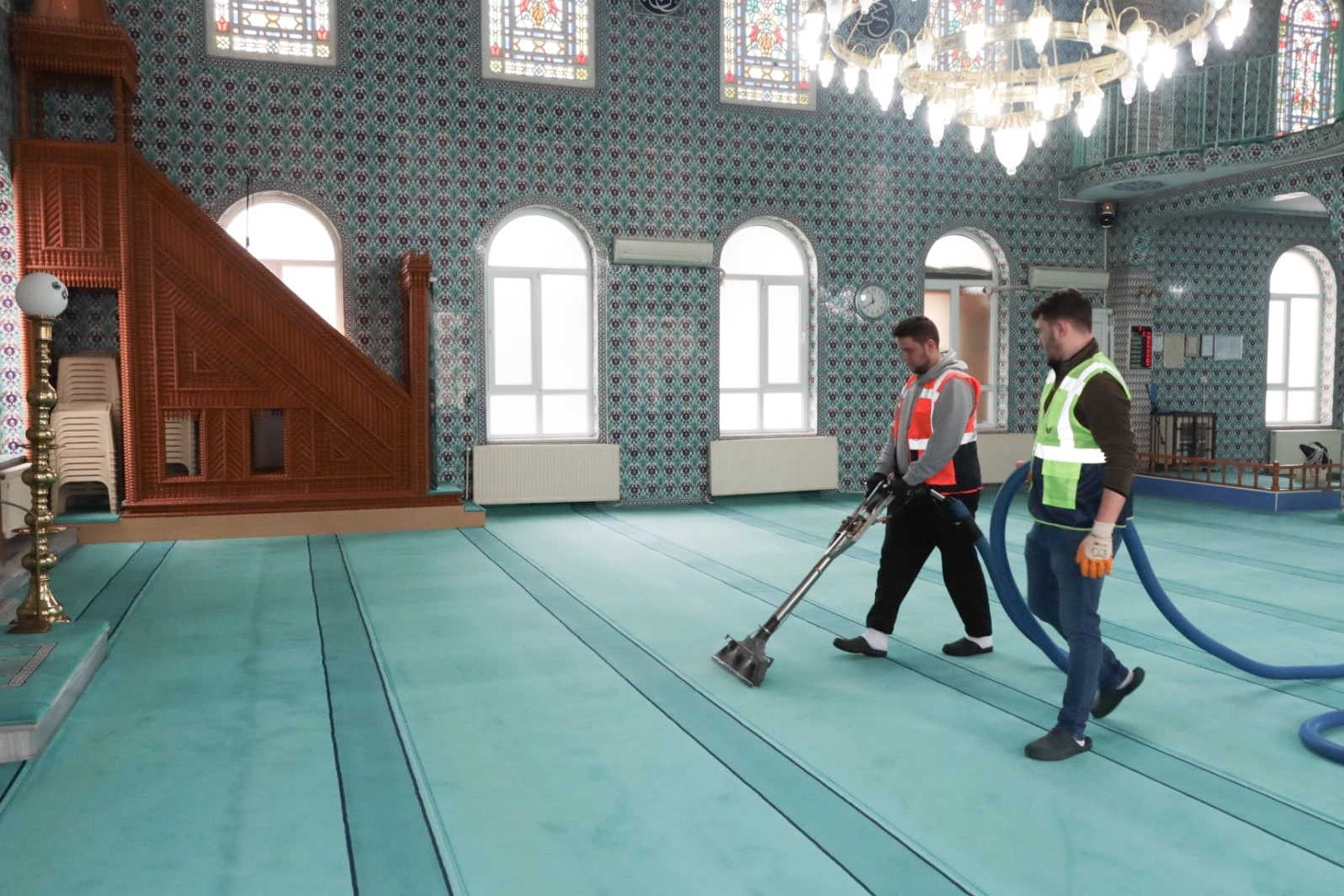 Temizlik çalışmaları kapsamında cami ve mescitlerin iç mekânları detaylı şekilde hijyenik hale getirilirken; halılar süpürülüp yıkanıyor, mihrap, minber ve kürsüler özenle siliniyor.