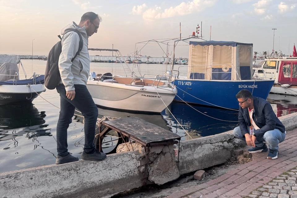 Bad Godesberg Parkı Balıkçı Barınağında meydana gelen çökme ile ilgili Yalova Jeoloji Mühendisleri Odası Başkanı Ozan Burak Cangir başkanlığındaki teknik ekip bölgede incelemelerde bulundu.