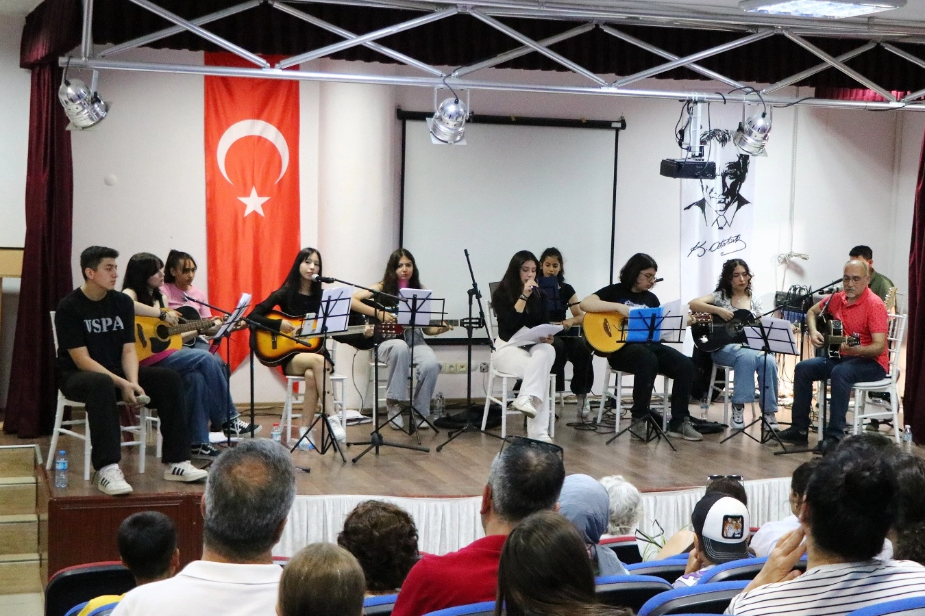 Gitar Öğretmeni Kemal Bayrı’nın rehberliğinde ilk sahne deneyimlerini yaşayan kursiyerler, salonu dolduran ailelerinden ve izleyicilerden yoğun alkış aldı