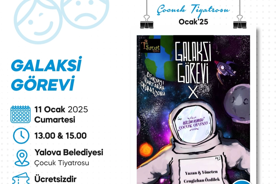 5-12 yaş grubundaki çocuklar için hazırlanan oyunun gösterimleri, saat 13.00 ve 15.00’te iki seans olarak yapılacak. Cengizhan Özdilek’in yazıp yönettiği oyun, çocukları galaksiler arası bir yolculuğa çıkarırken eğlendirici ve öğretici mesajlar içeriyor. Etkinlik ücretsiz, ancak yer sayısı sınırlı olduğu için önceden rezervasyon yapılması gerekiyor. Rezervasyonlar; etkinlik.yalova.bel.tr adresinden alınabiliyor. Yalova Belediyesi, bu etkinlikle çocuklara keyifli bir gün yaşatmayı hedefliyor.