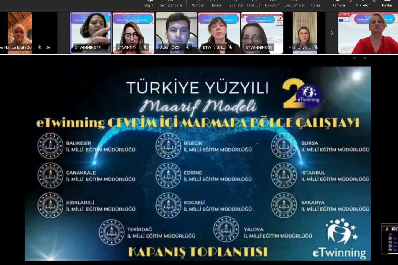 Millî Eğitim Bakanlığı Yenilik ve Eğitim Teknolojileri Genel Müdürlüğü bünyesinde; Balıkesir, Bilecik, Bursa, Çanakkale, Edirne, İstanbul, Kırklareli, Kocaeli, Sakarya, Tekirdağ ve Yalova İl Millî Eğitim Müdürlüklerinin eTwinning ekiplerinin iş birliğiyle düzenlenen Türkiye Yüzyılı Maarif Modeli eTwinning Çevrim İçi Marmara Bölge Çalıştayı, 16 Haziran 2025 Pazartesi günü gerçekleştirilen kapanış toplantısıyla başarıyla tamamlandı.
