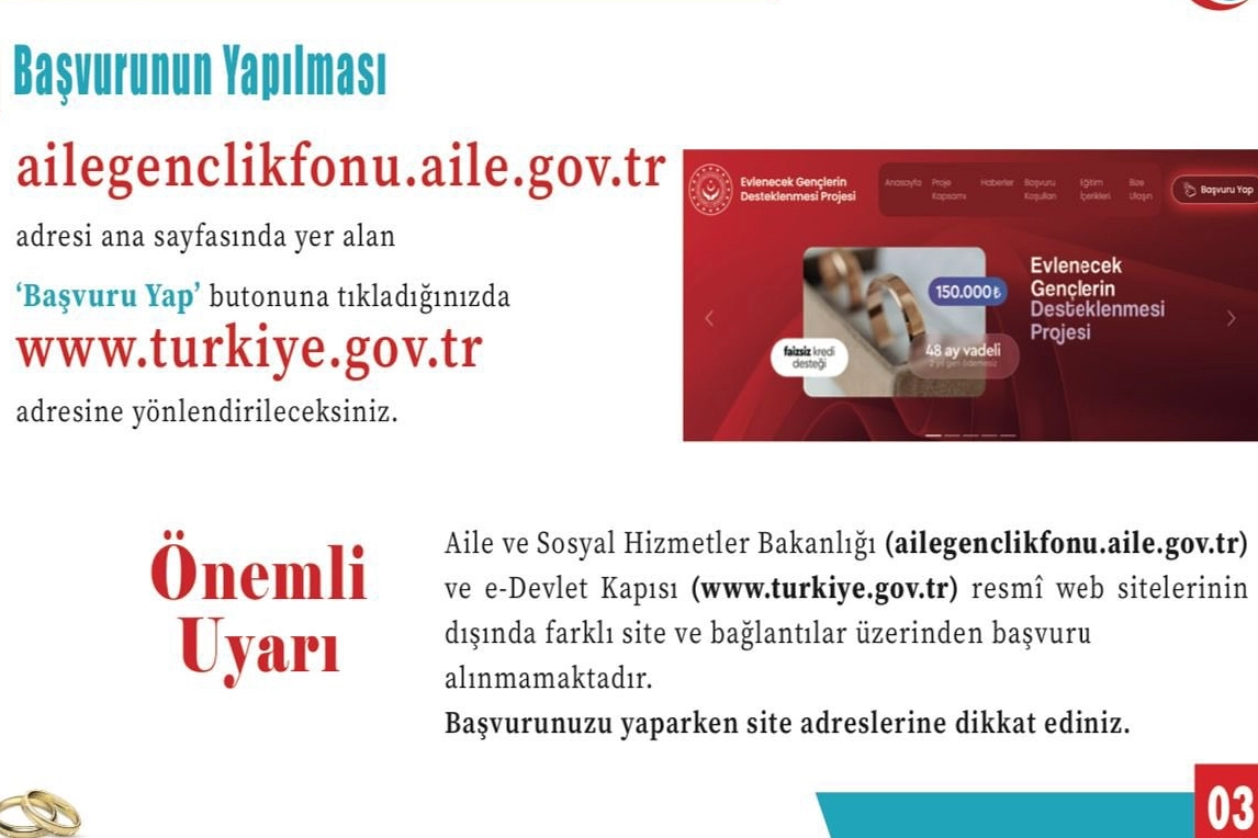 Yalova Aile ve Sosyal Hizmetler Müdürlüğü’nün sosyal medya hesabından yapılan açıklamada, son günlerde "Evlilik Kredisi" ismi kullanılarak vatandaşları dolandırmaya yönelik girişimlerin tespit edildiği belirtilerek, şu ifadelere yer verildi: "Dolandırıcılık girişimlerine karşı dikkatli olalım. Aşağıdaki resmi siteler haricinde herhangi bir link üzerinden başvuru kesinlikle yapılmamaktadır. Evlilik kredisine başvuru veya kredinin ödeme aşamasında herhangi bir ücret talep edilmemektedir. Lütfen kişisel bilgilerinizi koruyun, dolandırıcılara karşı dikkatli olun. Bakanlığımızca bu tip tüm dolandırıcılık faaliyetlerine karşı hukuki süreç başlatılmaktadır. Başvurular sadece resmi siteler 'https://ailegenclikfonu.aile.gov.tr' ve 'https://turkiye.gov.tr' üzerinden yapılmaktadır.”