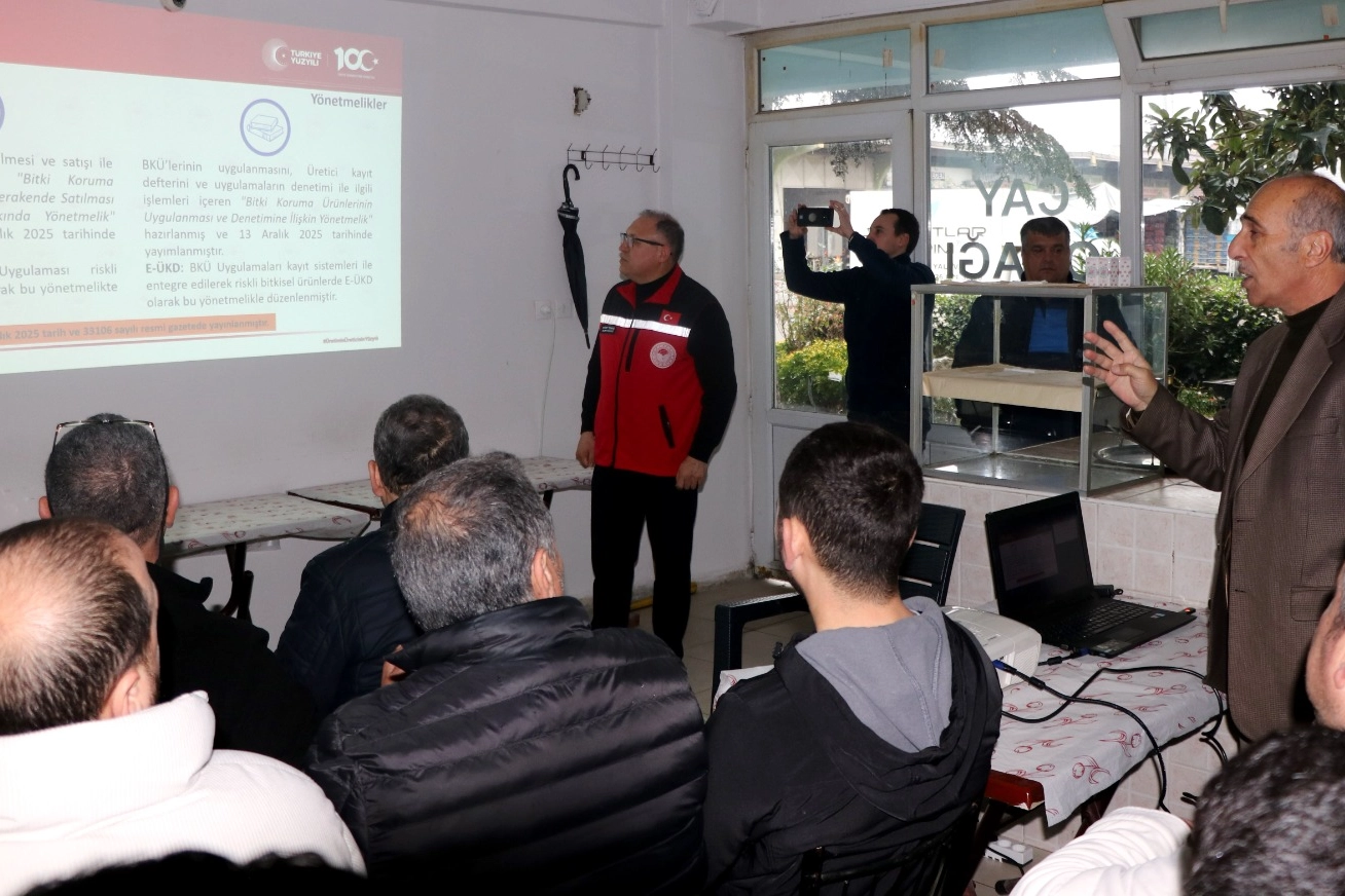 Gıda ve Yem Şube Müdürü Ahmet Tırnakçı’nın açılış konuşmasının ardından Bitkisel Üretim ve Bitki Sağlığı Şube Müdürlüğünden Mühendis Mahir Mete tarafından Bitki Koruma Ürünlerinin satışı ile ilgili iş ve işlemleri içeren “Bitki Koruma Ürünlerinin Toptan ve Perakende Satılması ile Depolanması Hakkındaki Yönetmelik” hakkında sunum eşliğinde bilgiler aktarırken Gıda ve Yem Şube Müdürlüğünden Mühendis Gürkan Sıcakyüz de gıda hijyeni ve izlenebilirlik sistemleri hakkında bilgiler aktardı.
