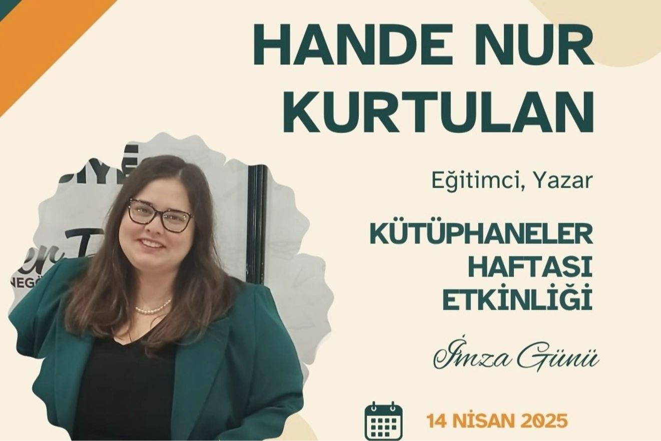 Kadıköy Belediyesi, "Kütüphaneler Haftası" etkinlikleri kapsamında Eğitimci ve Yazar Hande Nur Kurtulan’ı okurlarıyla bir araya getiriyor. 14 Nisan 2025 Pazartesi günü, saat 13:30 ile 17:00 arasında Kadıköy Belediyesi Kültür Evi ÇYDD Kadri-e Osman Yüksel 100. Yıl Kütüphanesi’nde düzenlenecek imza gününde, yazar katılımcılara kitaplarını imzalayacak ve eserleriyle ilgili soruları yanıtlayarak onlarla keyifli bir sohbet gerçekleştirecek. “Ateşin Karanlık Ruhu” ve “İmkansızlığın Karesi” gibi eserleriyle tanınan Hande Nur Kurtulan, okurlarıyla buluşarak yazarlık deneyimlerini ve kitaplarını derinlemesine tartışma fırsatı sunacak.