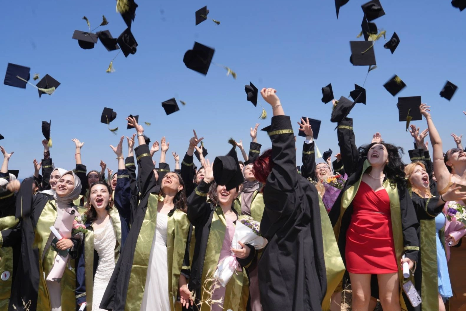 Tören sonunda öğrenciler, keplerini havaya fırlatarak mezuniyetlerini kutlarken, sahnede açtıkları pankartla Filistin'de yaşanan zulme dikkat çekti.