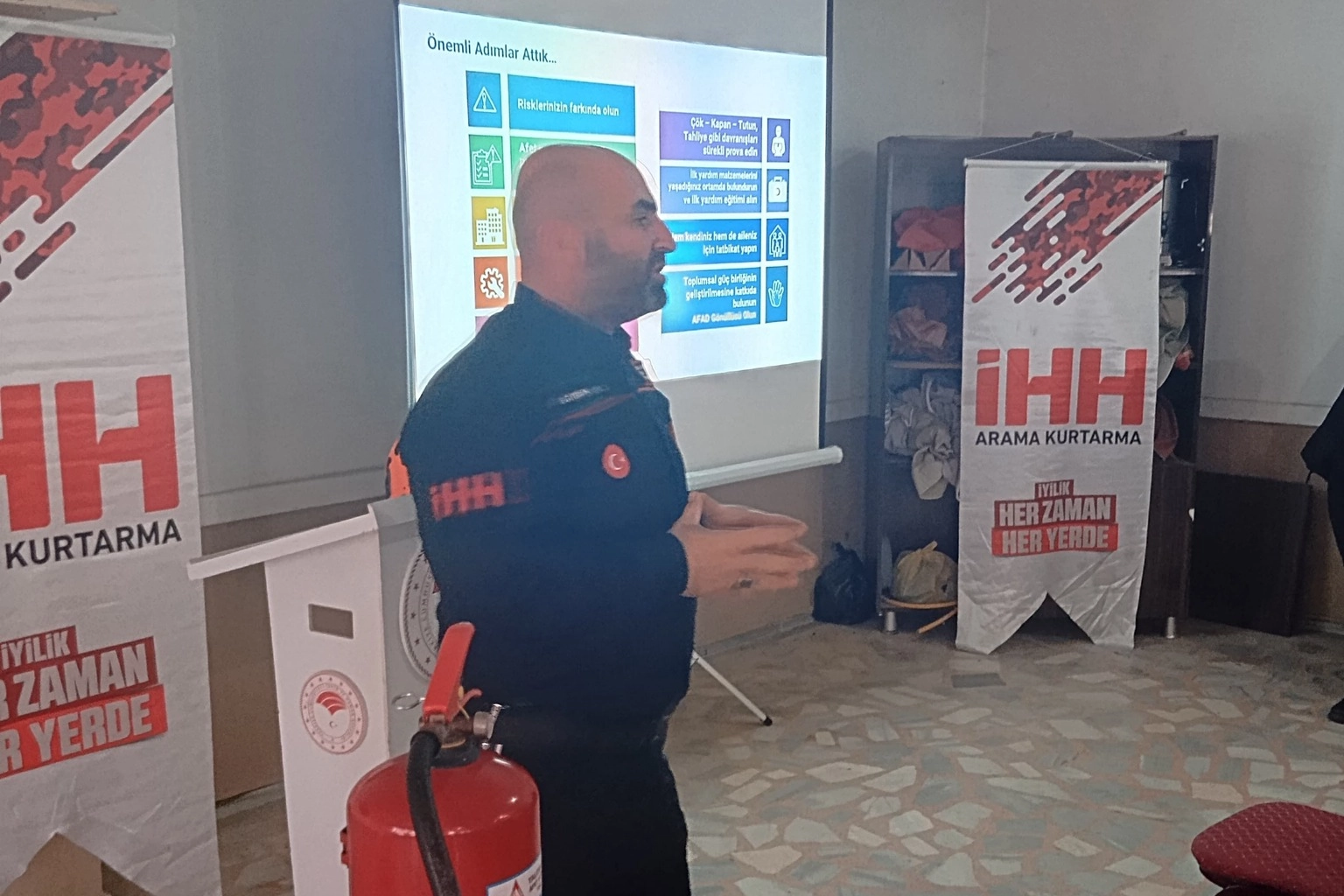 Yalova'nın Kazimiye Köyü'nde, İHH Arama Kurtarma Yalova tarafından gerçekleştirilen "Afetlerde Risk Azaltma ve Temel Afet Bilinci Eğitimi" kapsamında, vatandaşlara afetlere karşı bilinç kazandırılmaya yönelik önemli bir eğitim düzenlendi.