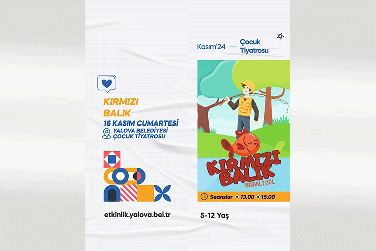 Yalova Çocuk Tiyatrosu’nda sahnelenecek Kırmızı Balık Yasaklı Göl adlı çocuk tiyatrosu, minik izleyicilerle buluşacak. Etkinlik, 13.00 ve 15.00 saatlerinde iki ayrı seansla gerçekleştirilecek. Eğlenceli ve eğitici bir tiyatro deneyimi sunmayı amaçlayan Kırmızı Balık Yasaklı Göl, doğa, arkadaşlık ve keşif temalarını işlerken, çocukları hayal güçlerini kullanmaya ve farklı bakış açıları geliştirmeye teşvik ediyor. Yalova Belediyesi, gerçekleştirilecek bu gösteri ile çocuklara keyifli ve öğretici bir etkinlik sunacak. Etkinliğe katılmak isteyen ailelerin, etkinlik.yalova.bel.tr adresi üzerinden rezervasyon yapmaları gerektiği belirtildi. Rezervasyonun etkinlik günü katılım için zorunlu olup, kontenjanla sınırlı olduğu ifade edildi.